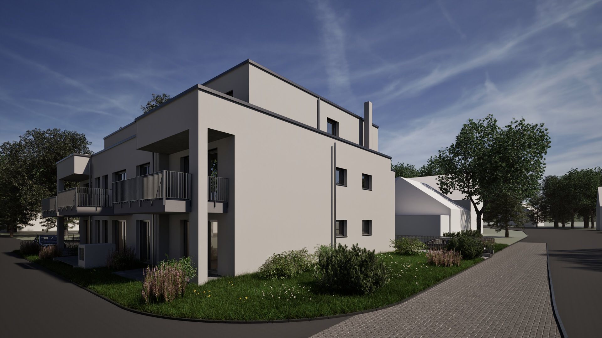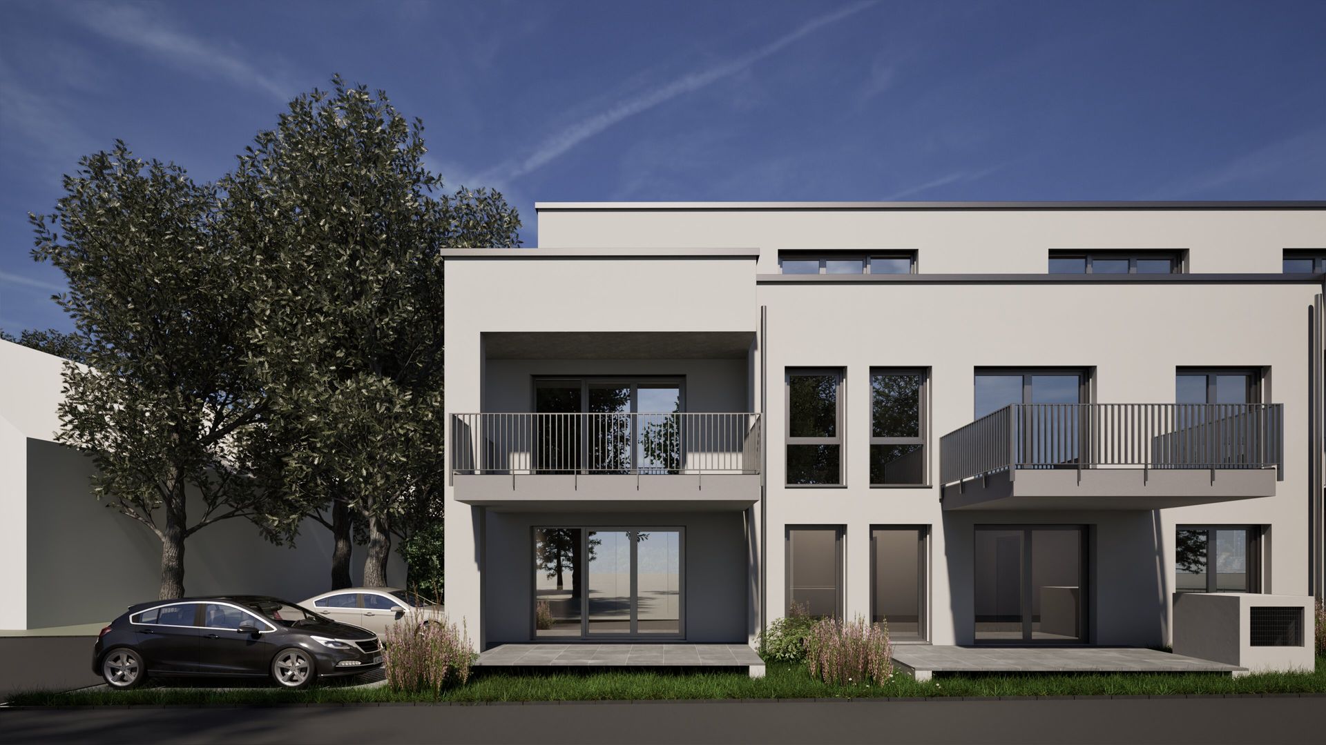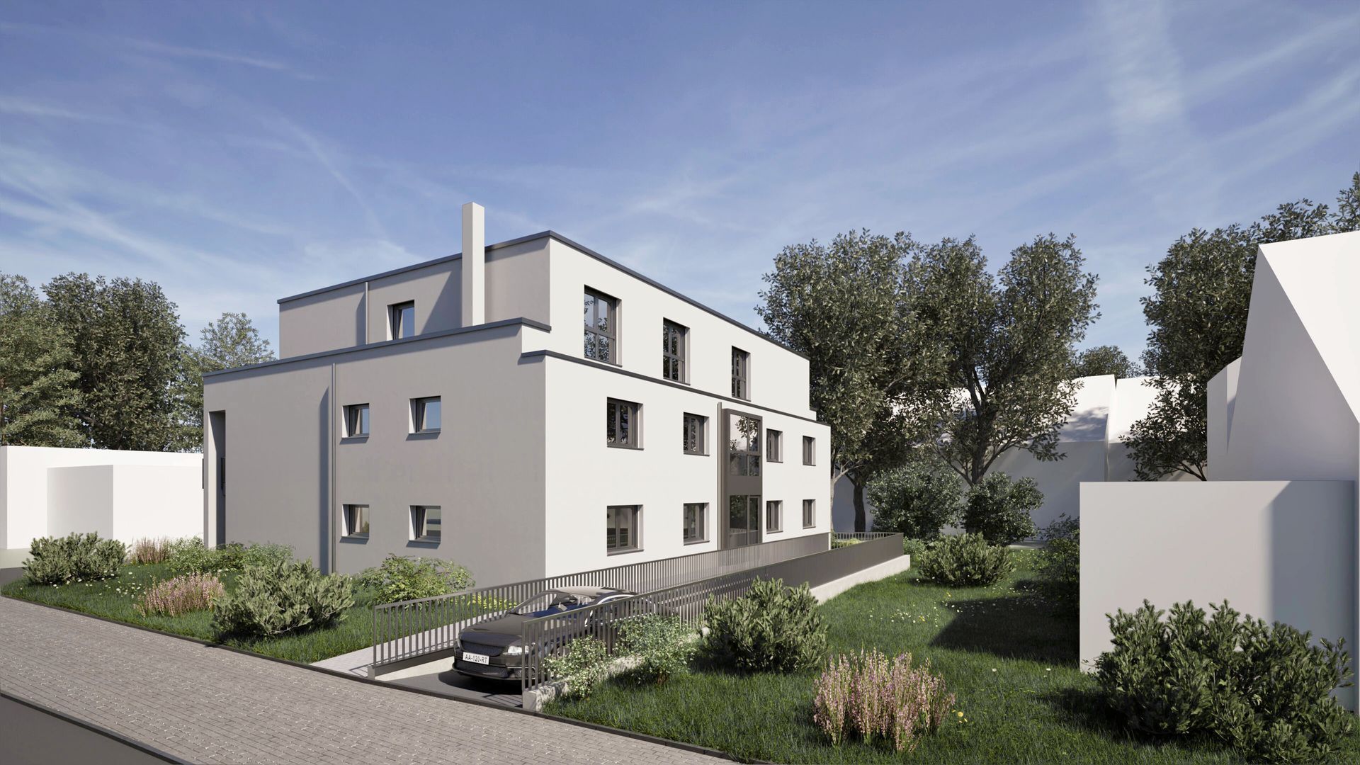 Dreigeschossiger Neubau eines Mehrfamilienhauses mit 8 Wohneinheiten in Bergisch Gladbach. Das Gebäude umfasst zwei Vollgeschosse und ein Staffelgeschoss mit Flachdach sowie ca. 700 m² Wohnfläche. Die Fassade ist hell verputzt und verleiht dem Gebäude eine moderne und klare Optik. Ergänzt wird das Haus durch eine Tiefgarage.