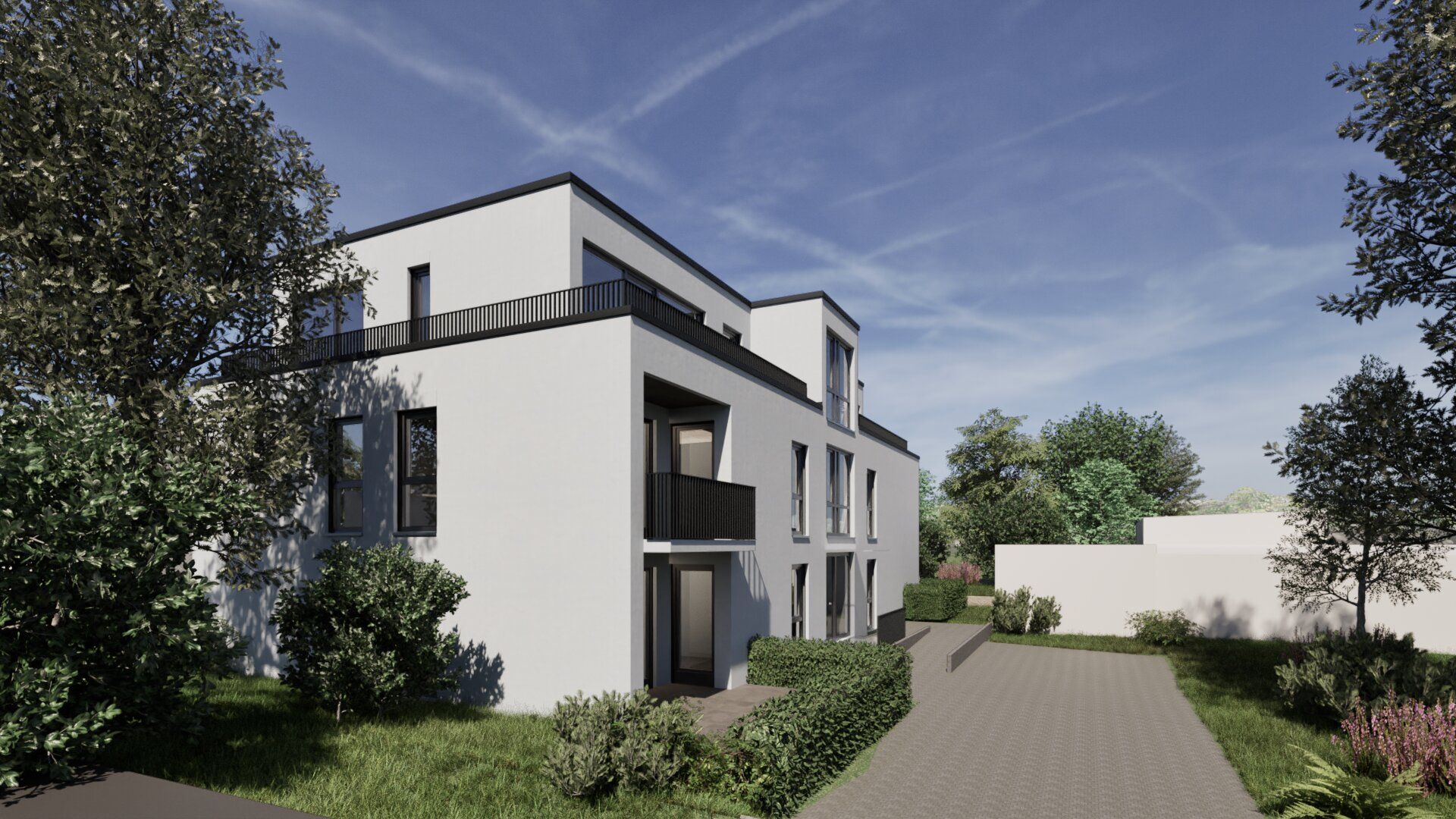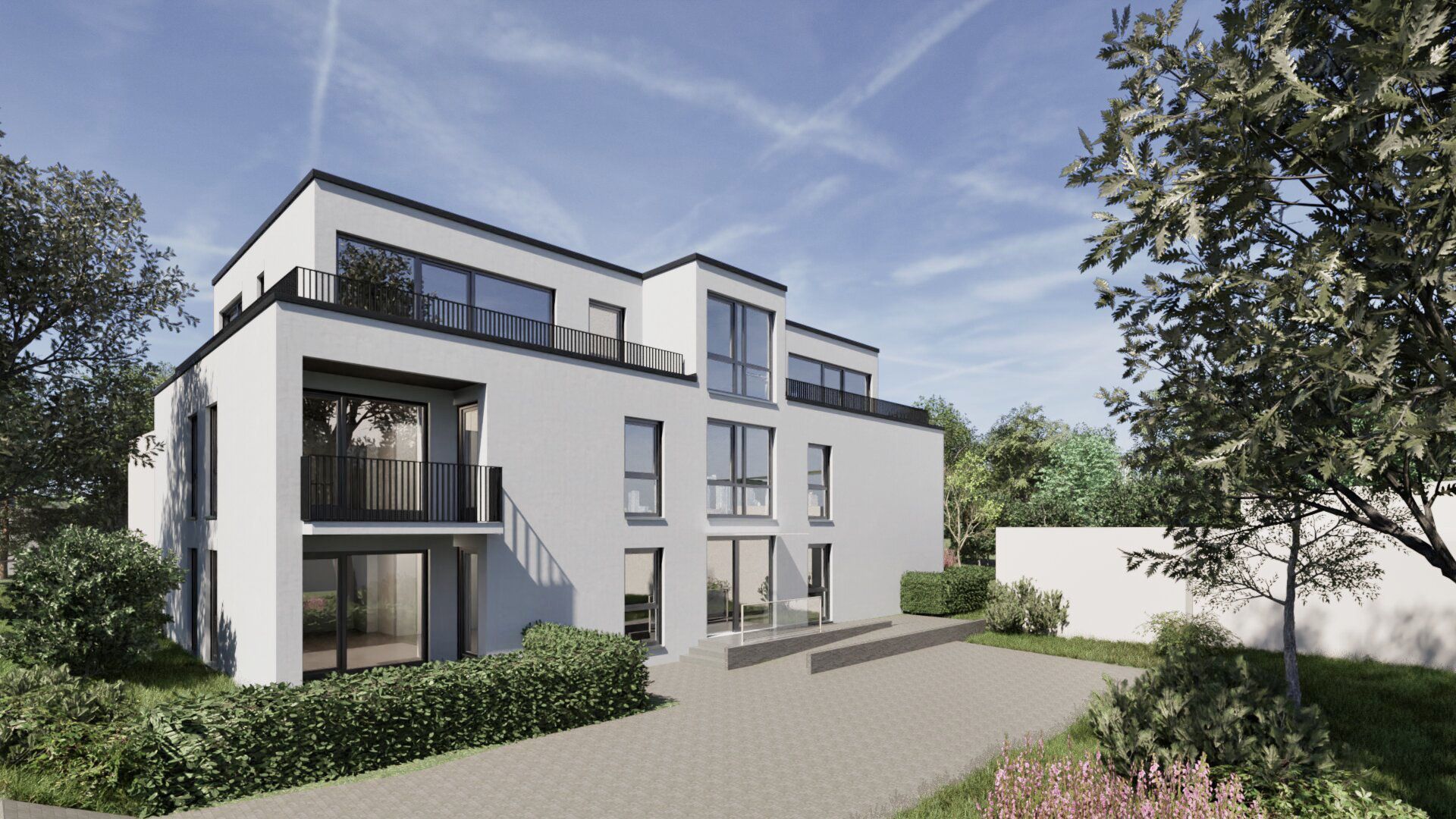 Dreigeschossiger Neubau eines Mehrfamilienhauses mit 6 Wohneinheiten in Bergisch Gladbach, bestehend aus zwei Vollgeschossen und einem Staffelgeschoss mit Flachdach. Das Gebäude umfasst ca. 510 m² Wohnfläche. Die Fassade ist hell verputzt und verleiht dem Gebäude eine moderne und zurückhaltende Erscheinung.