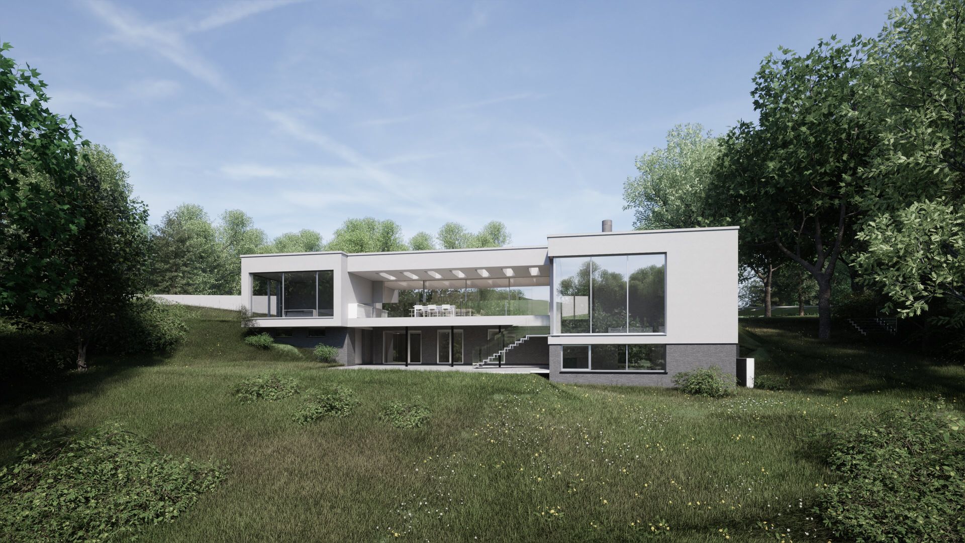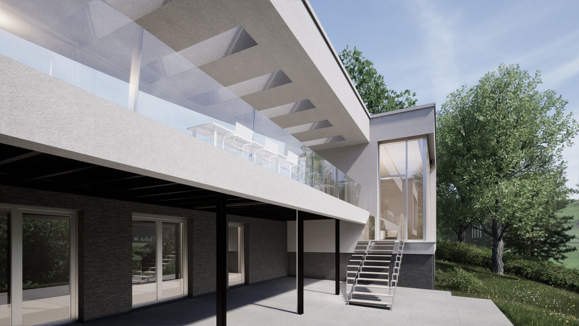 Bei dem Bauvorhaben handelt es sich um die Umbau- und Erweiterungsmaßnahme eines zweigeschossigen Einfamilienhauses mit Flachdach in Bergisch Gladbach. Das Gebäude umfasst ca. 410 m² Wohnfläche und bietet separate Bereiche für Wohnen, Essen und Kochen. Es verfügt zudem über eine Einliegerwohnung. Die Fassade ist hell verputzt, während der Sockel mit abgetöntem Klinker versehen wurde.