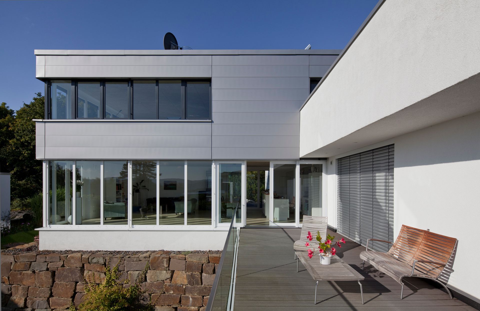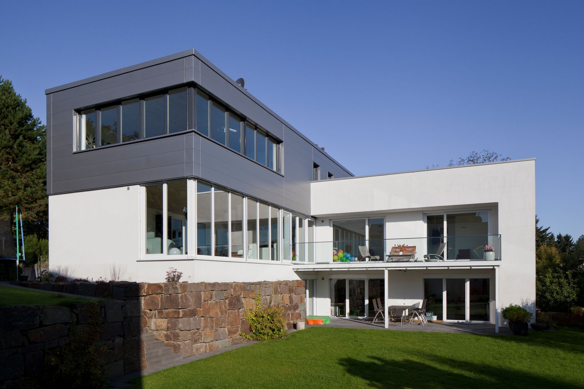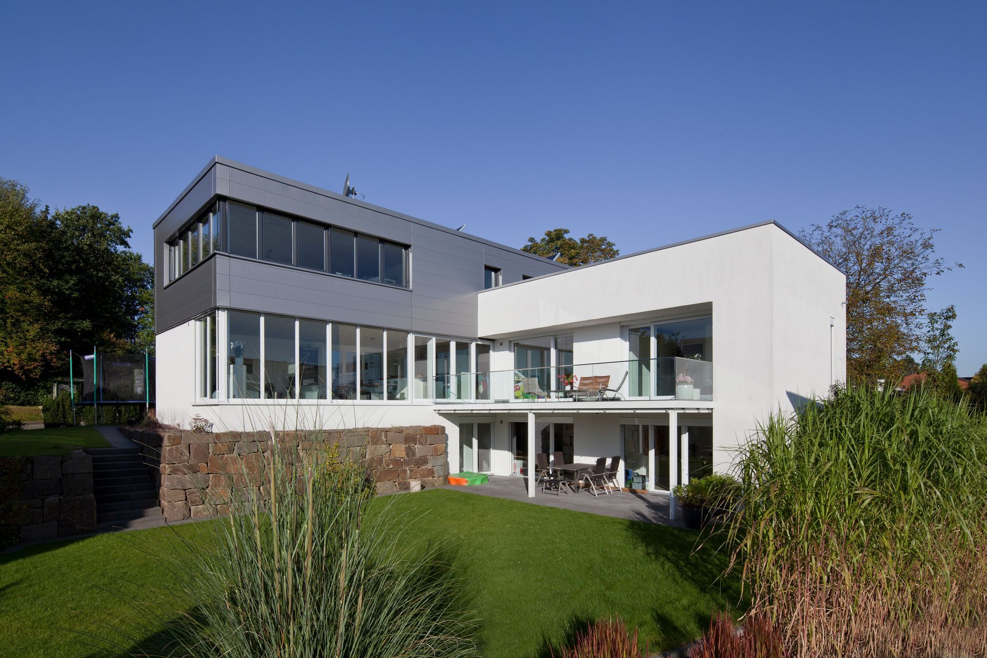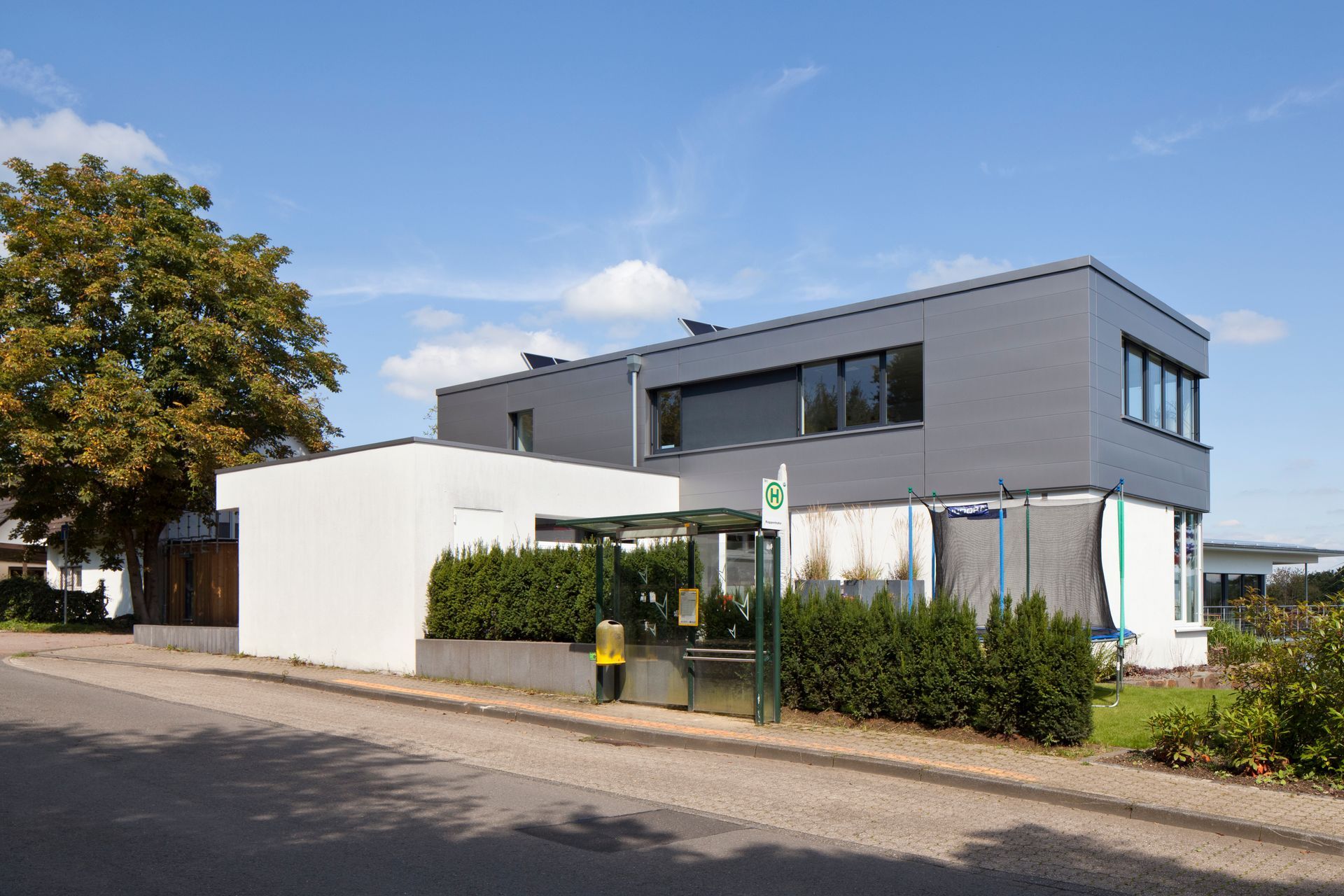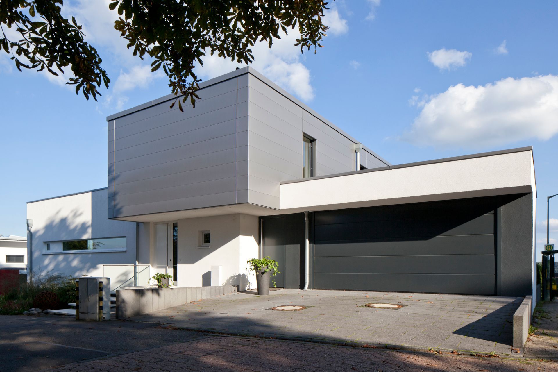 Zweigeschossiger Neubau eines Zweifamilienhauses in Overath, bestehend aus zwei Kuben mit Flachdach, wobei ein Kubus teilweise schwebend ausgeführt ist. Das Gebäude umfasst ca. 190 m² Wohnfläche. Die Fassade ist hell verputzt, der höherliegende Kubus ist dunkel angetönt. Ergänzt wird das Haus durch eine Garage.