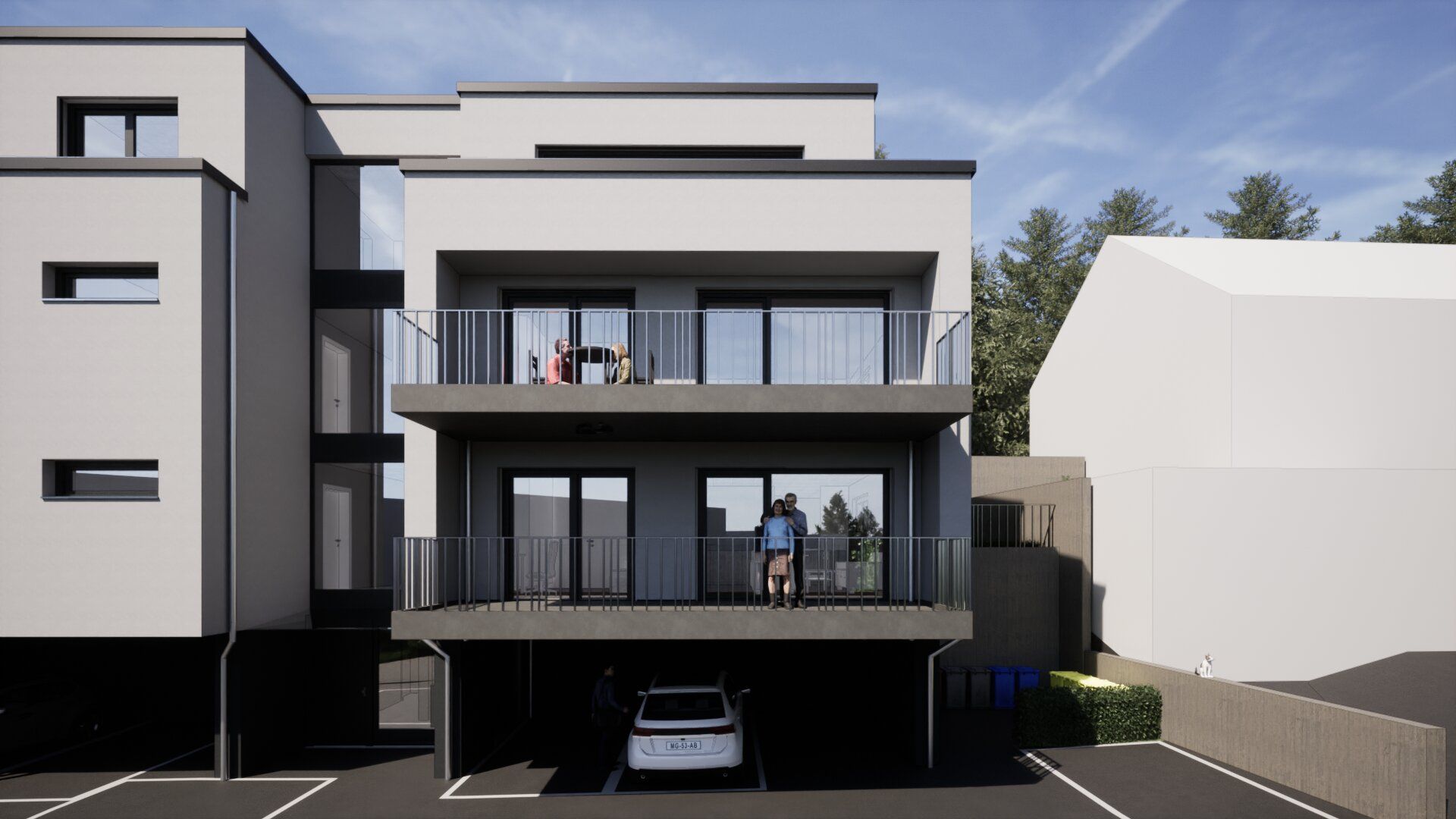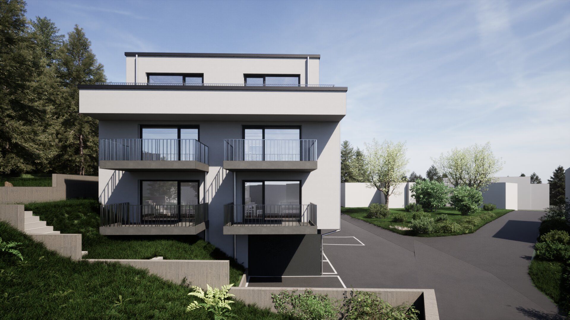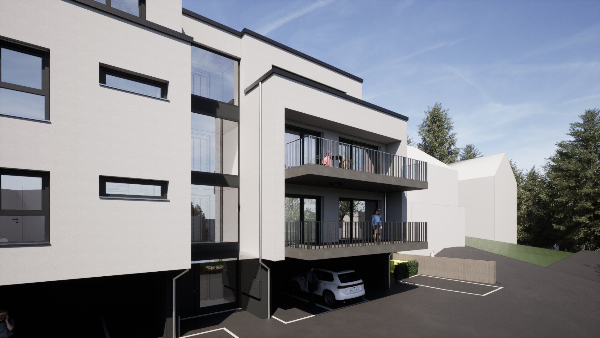 Dreigeschossiger Neubau eines Mehrfamilienhauses mit 15 Wohneinheiten in Bergisch Gladbach. Das Gebäude umfasst zwei Vollgeschosse und ein Staffelgeschoss mit Flachdach sowie ca. 590 m² Wohnfläche. Die Fassade ist hell verputzt. Unter dem Gebäude befindet sich eine offene Garage.