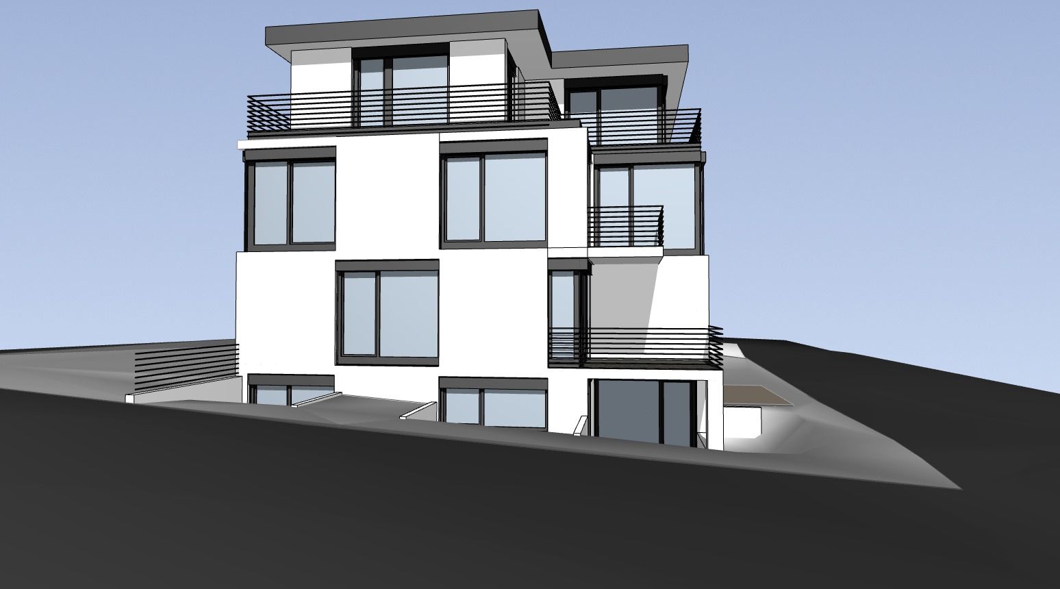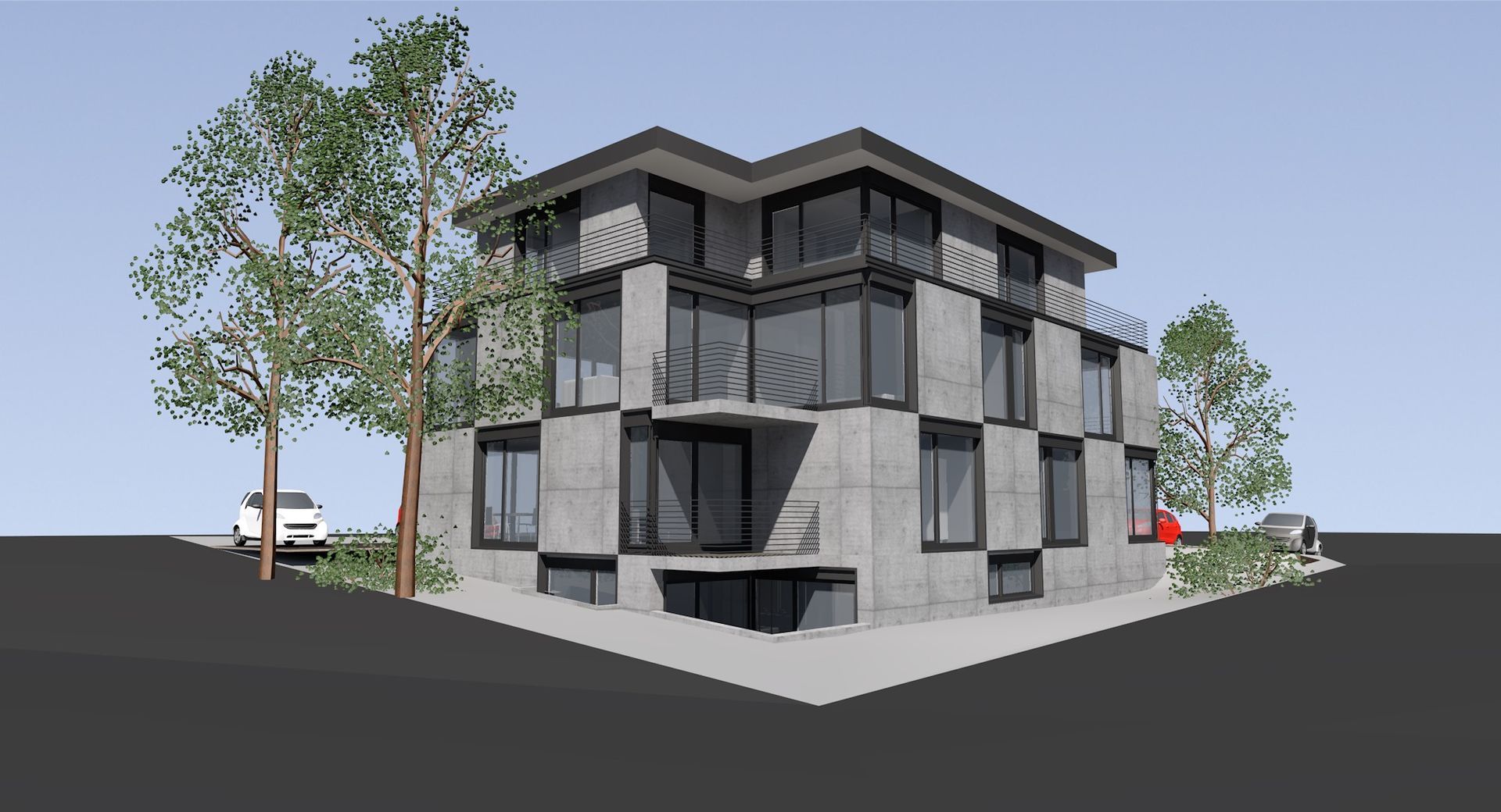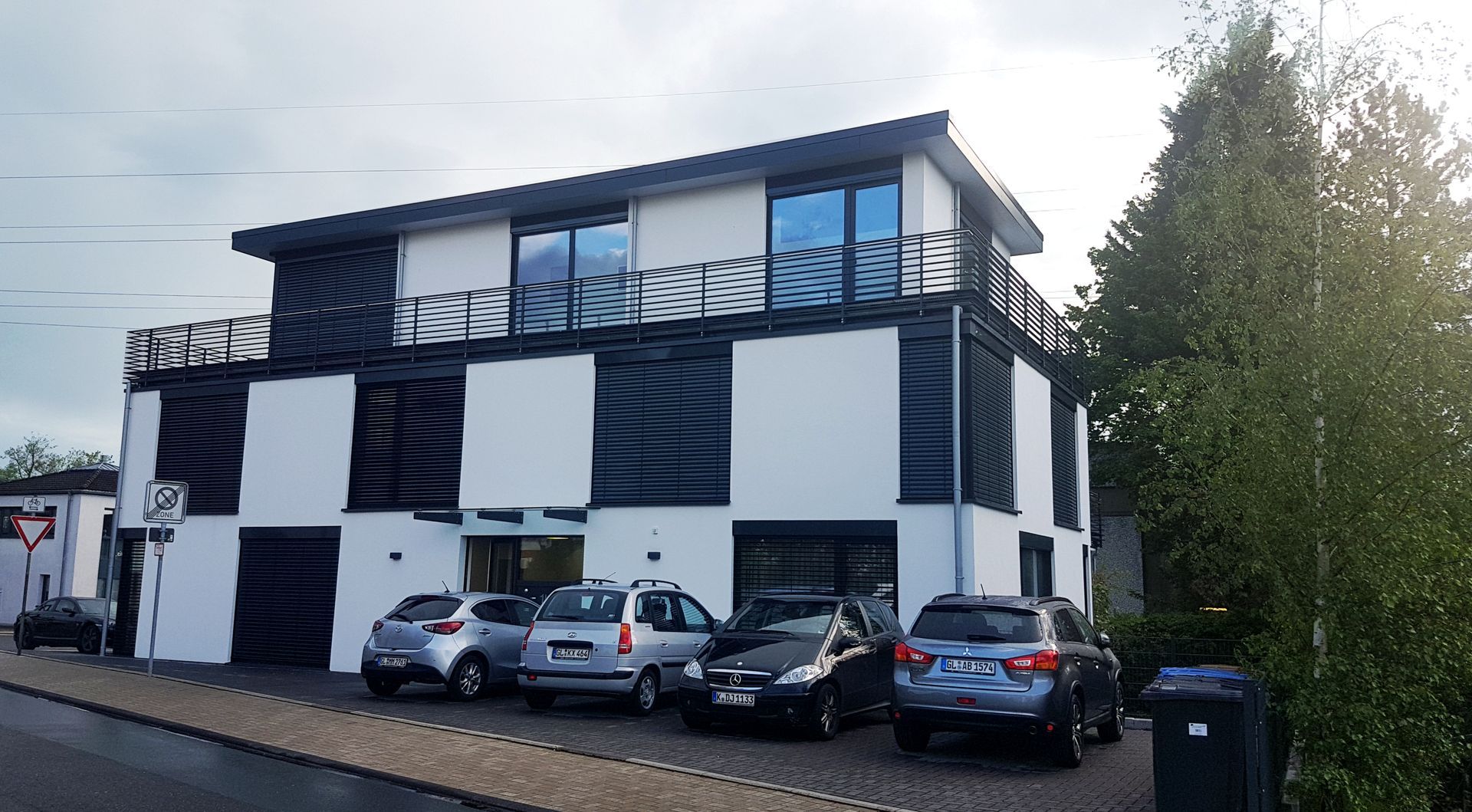 Dreigeschossiger Neubau eines Mehrfamilienhauses mit 6 Wohneinheiten in Bergisch Gladbach. Das Gebäude umfasst zwei Vollgeschosse und ein Staffelgeschoss sowie ca. 565 m² Wohnfläche. Die Fassade ist durch eine versetzte, annähernd quadratische Fensteraufteilung in Schwarz und Weiß gegliedert, was dem Gebäude eine moderne und klare Struktur verleiht.