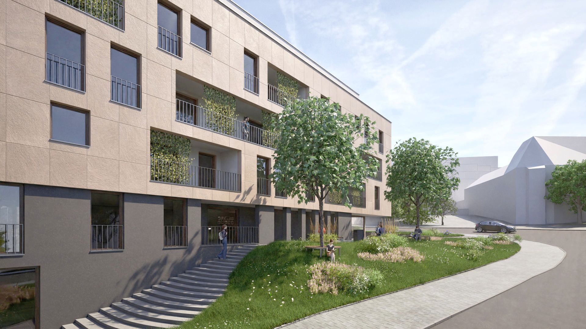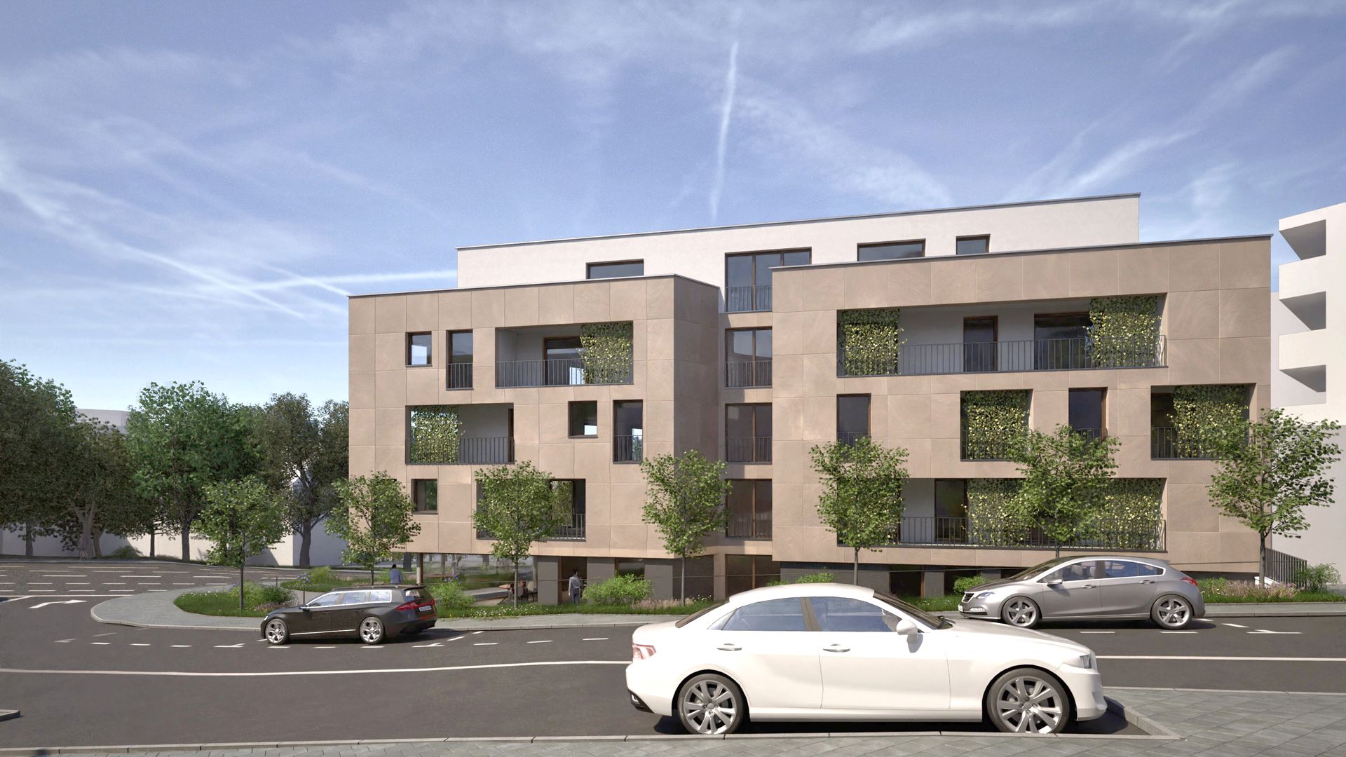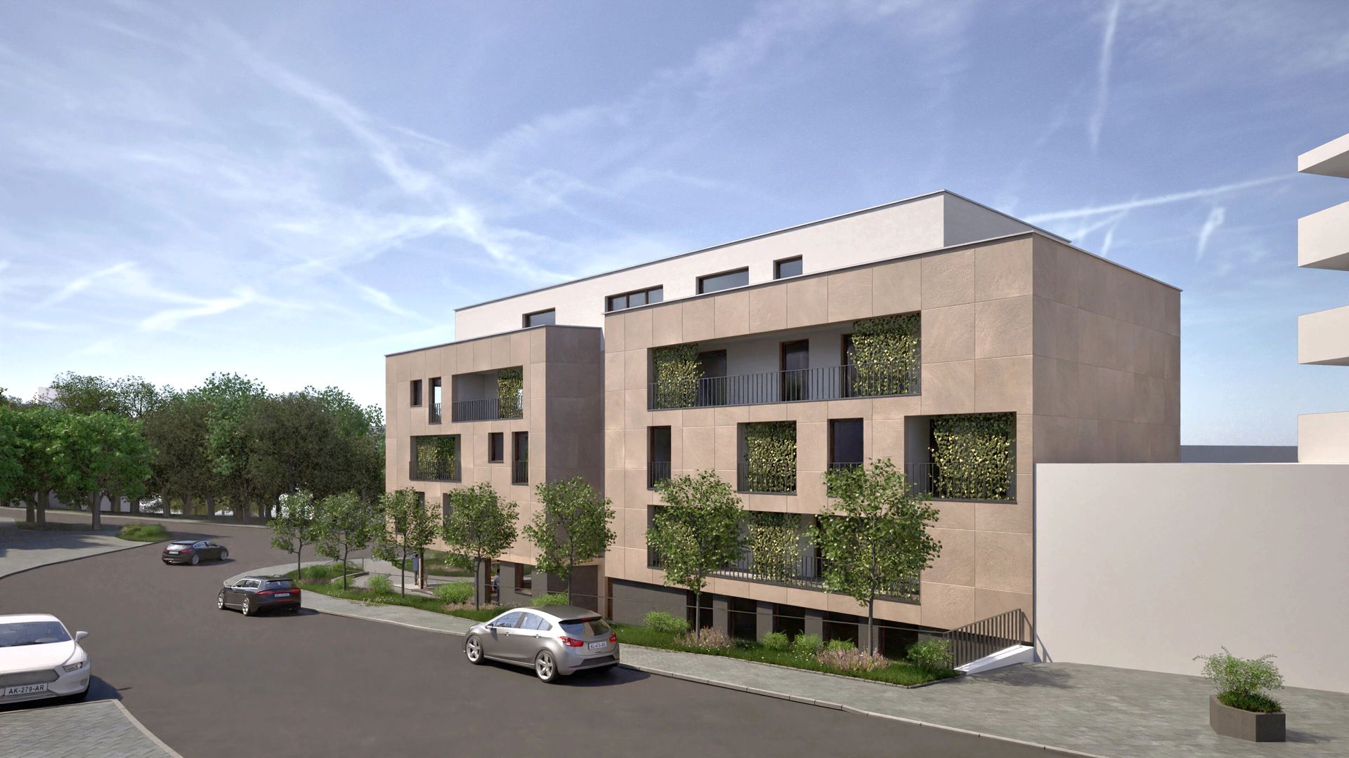 Fünfgeschossiger Neubau eines Wohn- und Geschäftshauses mit vier Vollgeschossen und einem farblich abgesetzten Staffelgeschoss, das sich gestalterisch zurücknimmt. Die Fassade ist mit Natursteinplatten verkleidet, während die Loggien hell verputzt sind und für eine differenzierte Fassadengestaltung sorgen. Ergänzt wird das Gebäude durch eine Tiefgarage.