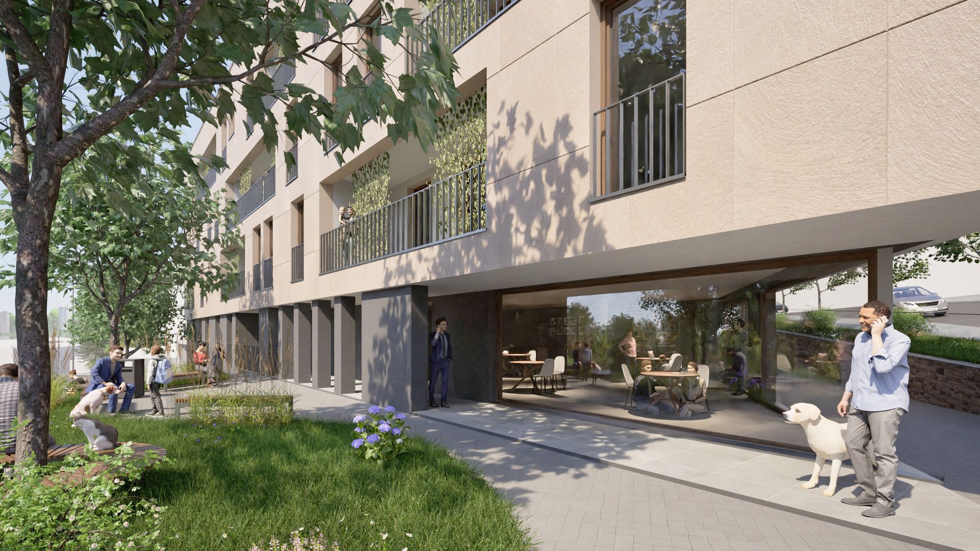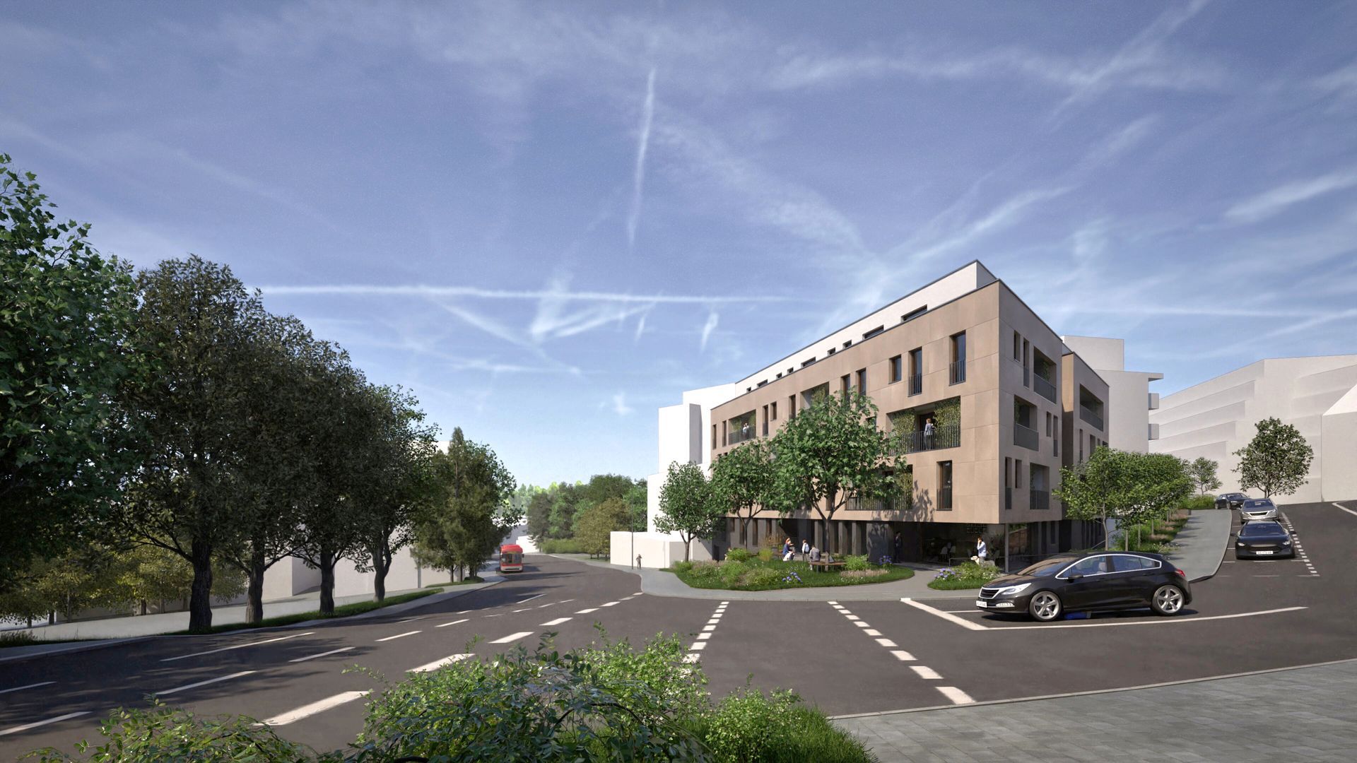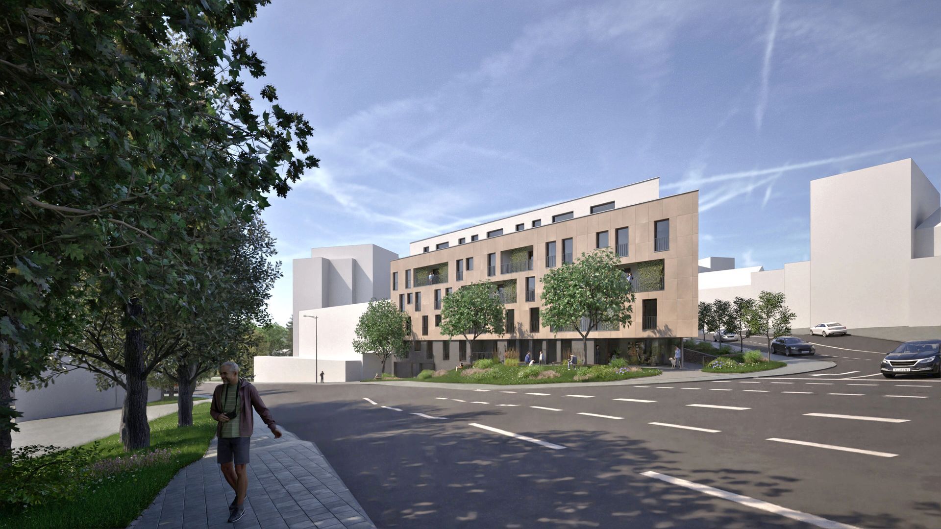Fünfgeschossiger Neubau eines Wohn- und Geschäftshauses mit vier Vollgeschossen und einem farblich abgesetzten Staffelgeschoss, das sich gestalterisch zurücknimmt. Die Fassade ist mit Natursteinplatten verkleidet, während die Loggien hell verputzt sind und für eine differenzierte Fassadengestaltung sorgen. Ergänzt wird das Gebäude durch eine Tiefgarage.