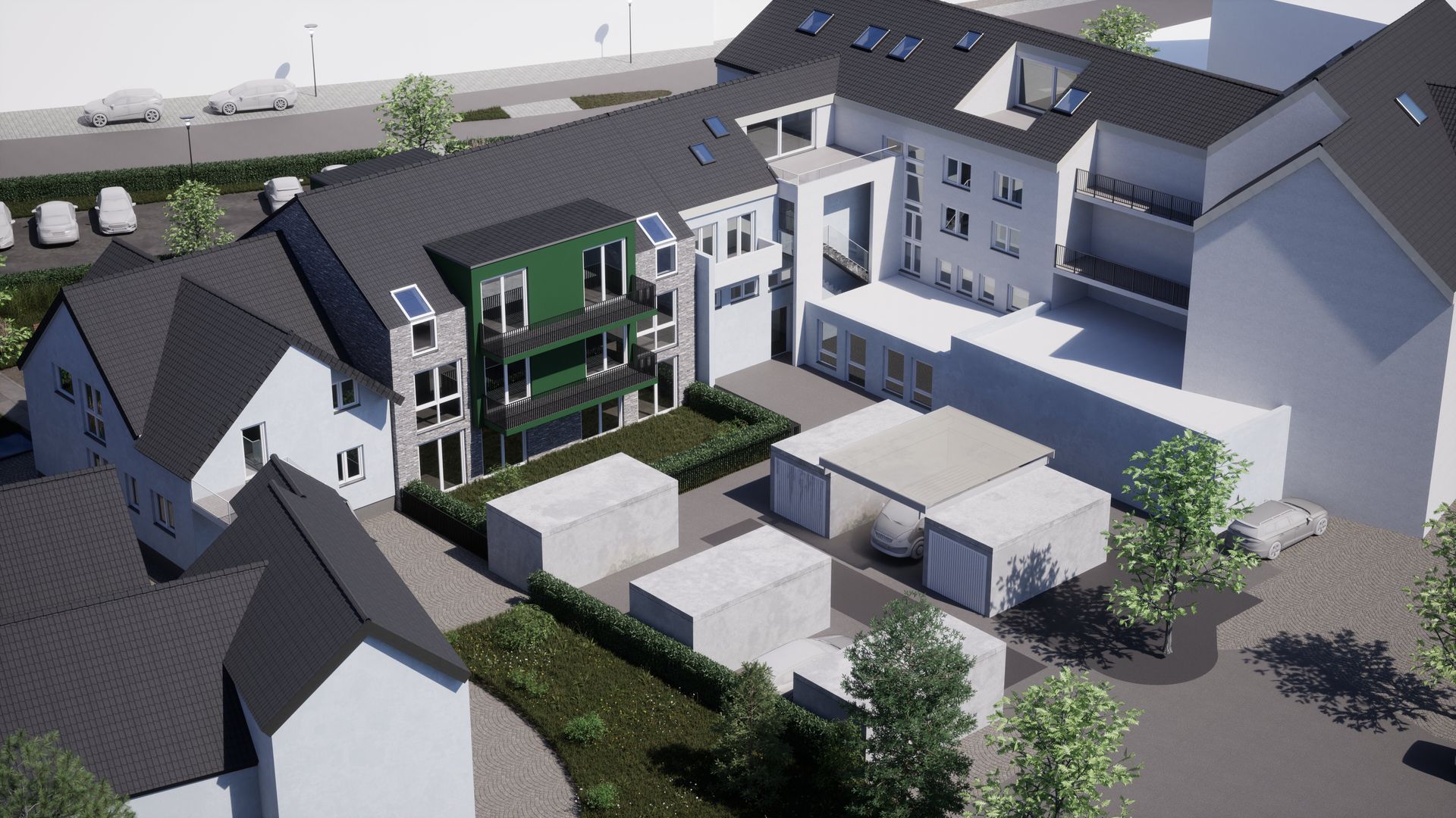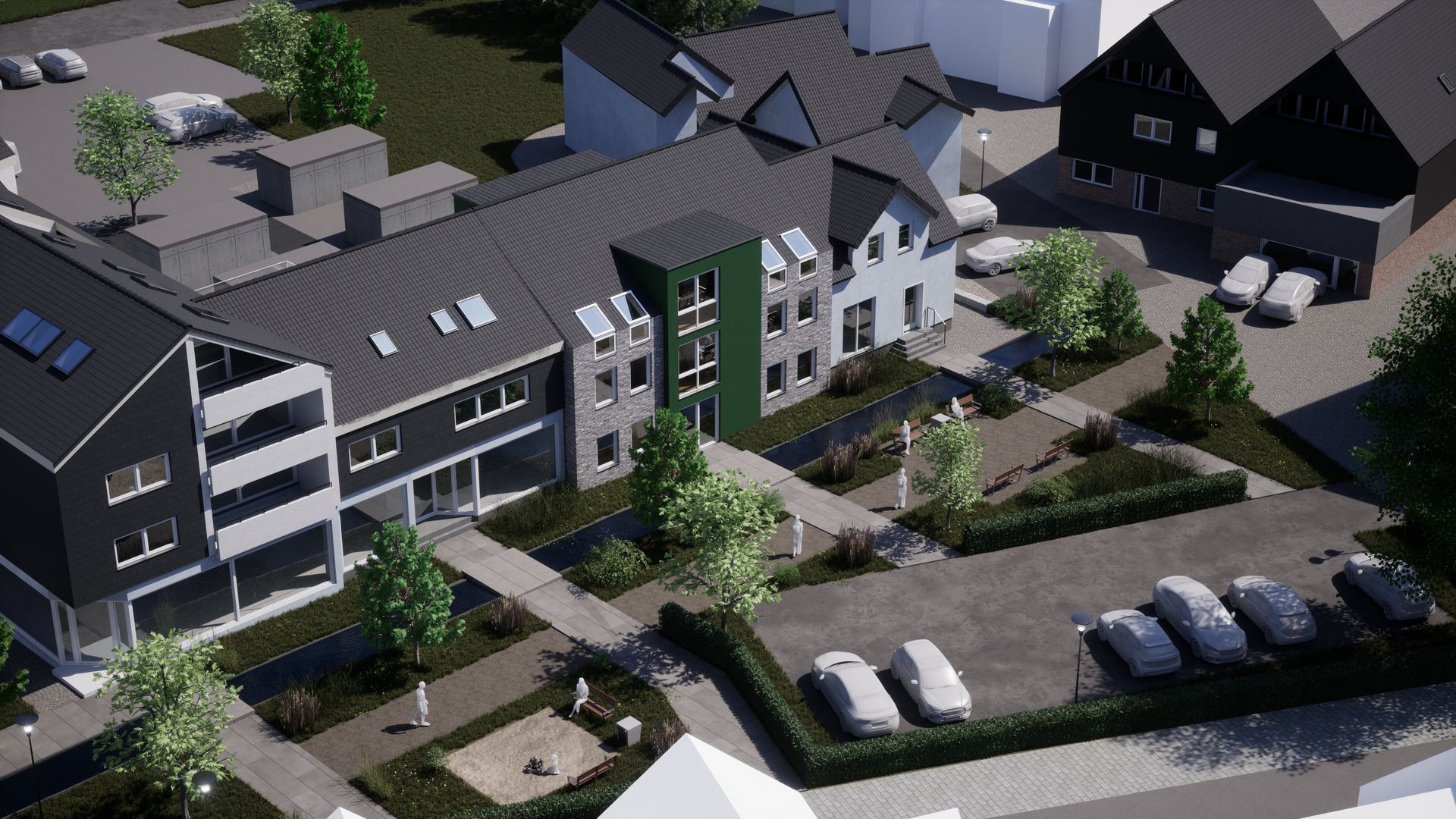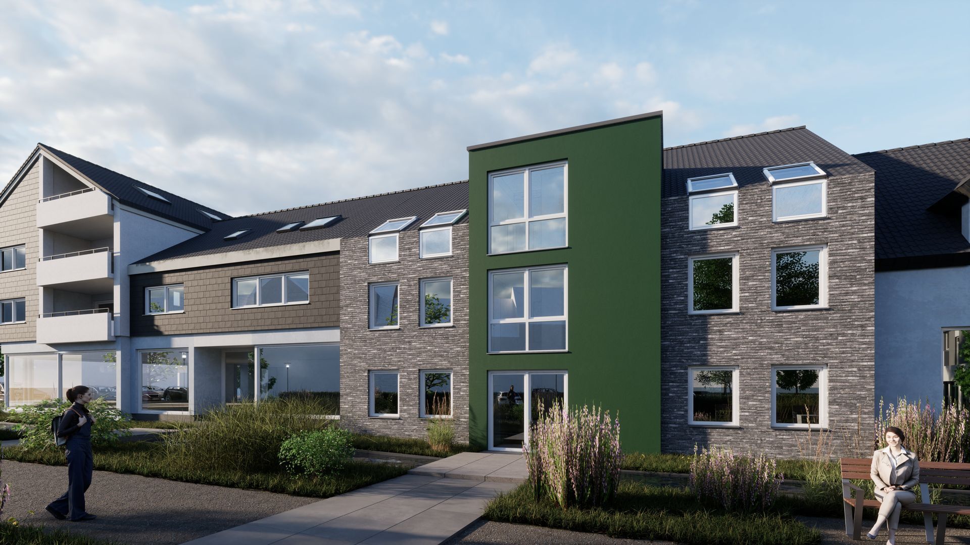 Umbau und Sanierung eines zweigeschossigen Mehrfamilienhauses mit Satteldach in Marienheide. Das Gebäude umfasst ca. 260 m² Wohnfläche und erhält im Zuge der Maßnahme eine moderne, zugleich regional verankerte Gestaltung. Die Fassade wird mit Naturschiefer verkleidet und greift damit typische Elemente der bergischen Bauweise auf. Der Eingangsbereich ist in einem markanten Dunkelgrün gehalten und setzt einen bewussten gestalterischen Akzent. Der gesamte Entwurf verbindet moderne Formensprache mit einem bergischen Hauch.