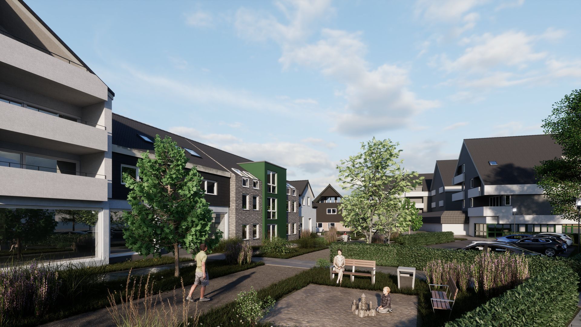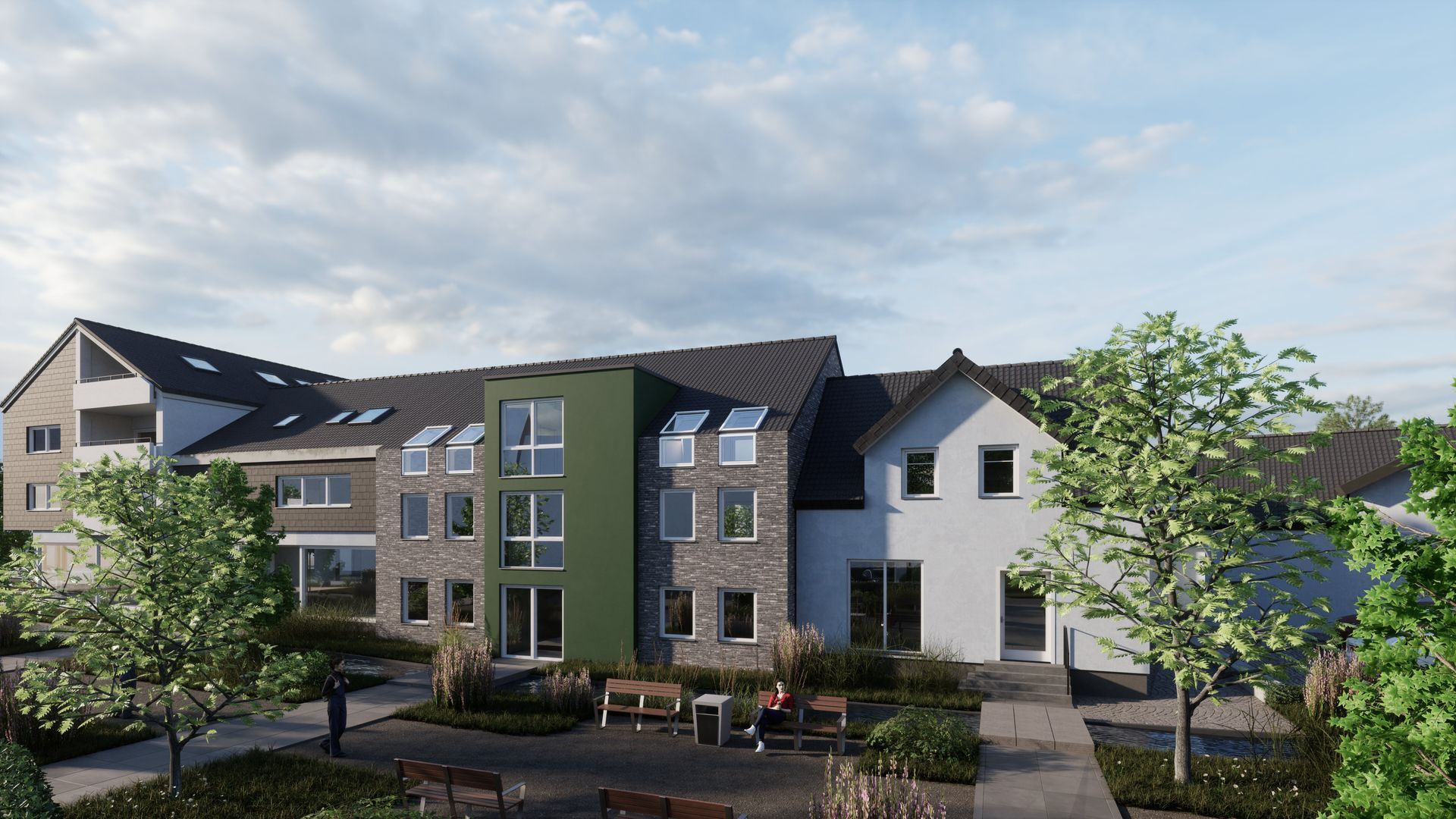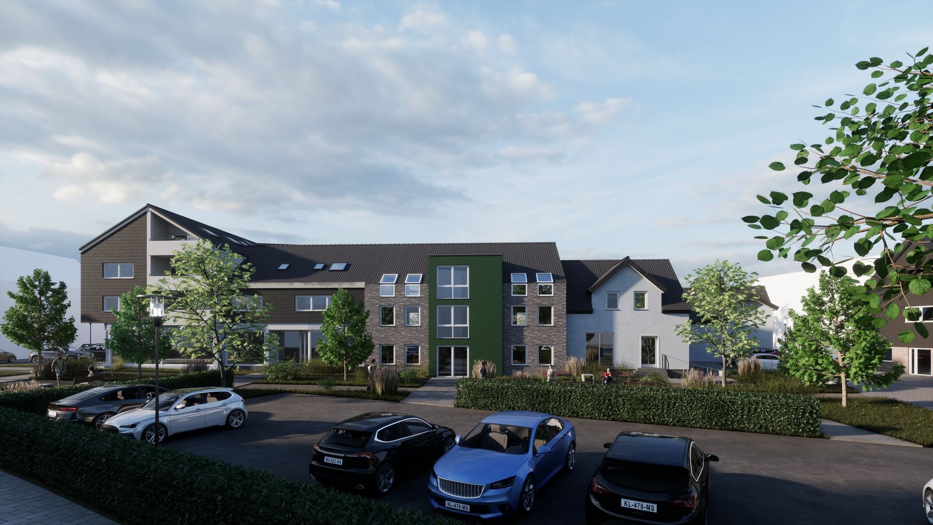 Umbau und Sanierung eines zweigeschossigen Mehrfamilienhauses mit Satteldach in Marienheide. Das Gebäude umfasst ca. 260 m² Wohnfläche und erhält im Zuge der Maßnahme eine moderne, zugleich regional verankerte Gestaltung. Die Fassade wird mit Naturschiefer verkleidet und greift damit typische Elemente der bergischen Bauweise auf. Der Eingangsbereich ist in einem markanten Dunkelgrün gehalten und setzt einen bewussten gestalterischen Akzent. Der gesamte Entwurf verbindet moderne Formensprache mit einem bergischen Hauch.
