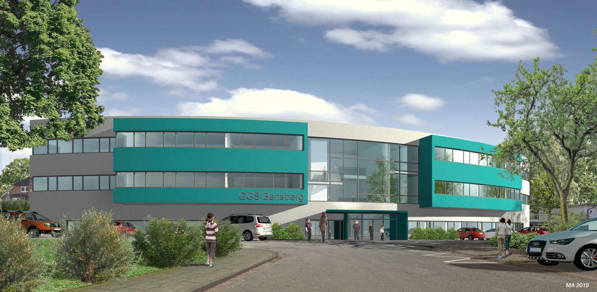 Neubau der Gemeinschaftsgrundschule Bensberg mit integrierter Sporthalle in Bergisch Gladbach. Der Neubau umfasst eine Gesamtnutzfläche von ca. 3.550 m², davon entfallen rund 620 m² auf die Sporthalle mit zugehörigen Nebenräumen. Der Baukörper ist als Kreissegment konzipiert, um das Grundstück optimal auszunutzen und gleichzeitig eine offene, großzügige Lernumgebung zu schaffen. Die weiß gehaltene Fassade wird durch türkisfarbene, akzentuierte Auskragungen belebt und verleiht dem Gebäude eine moderne, freundliche Ausstrahlung.