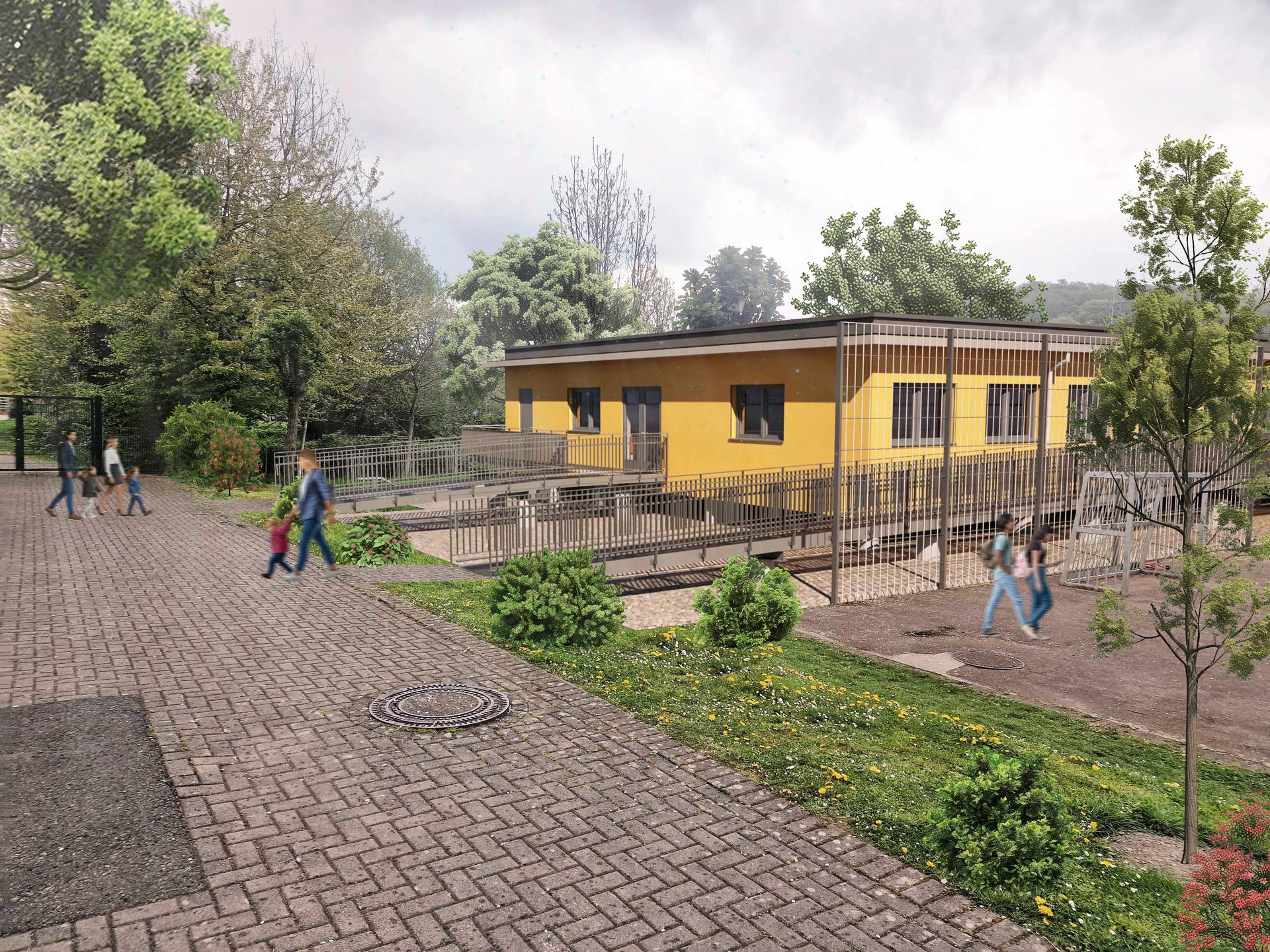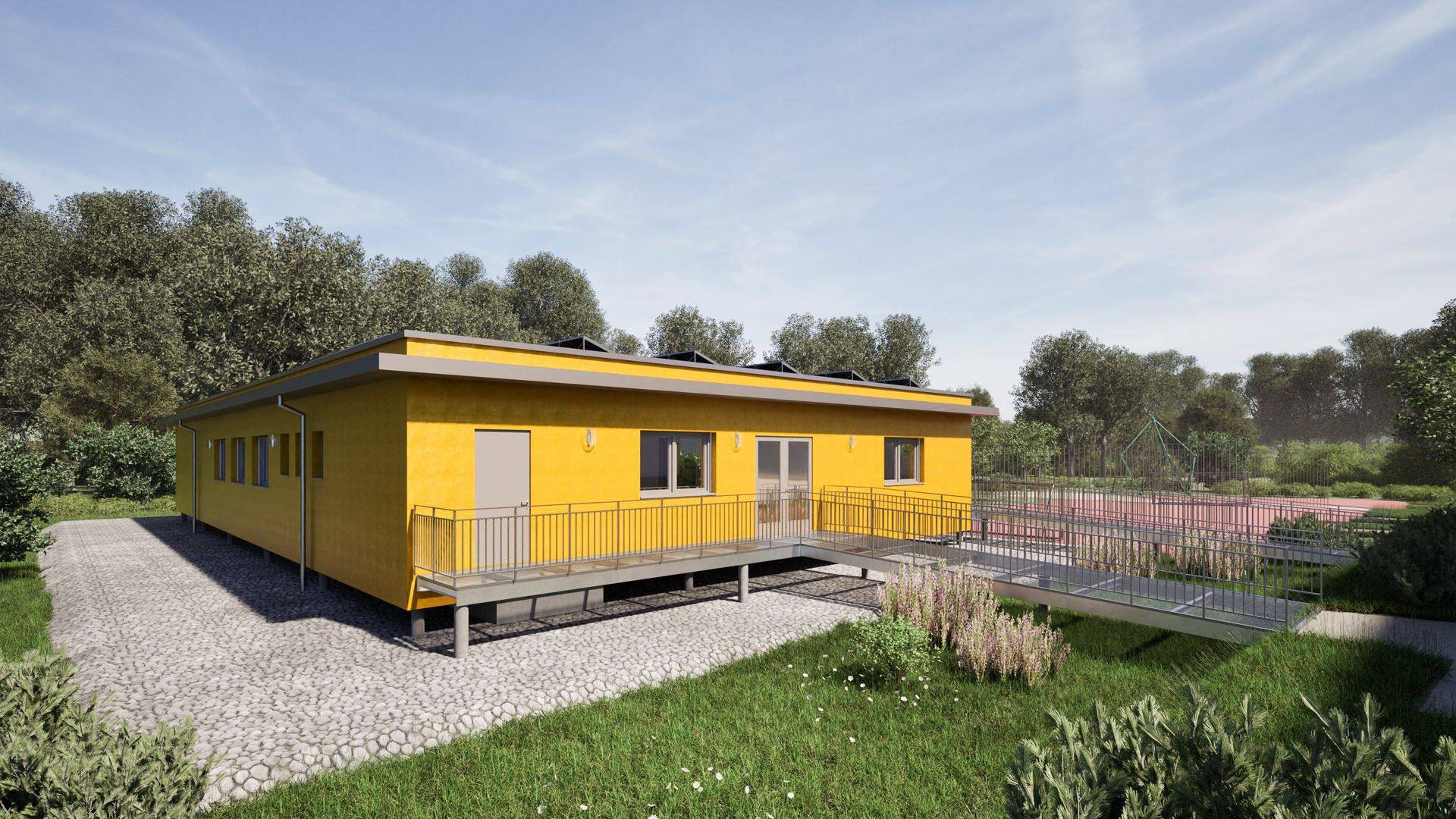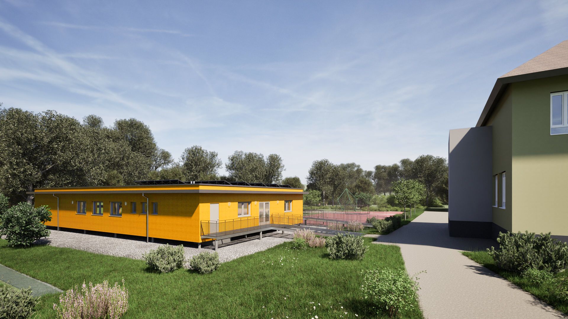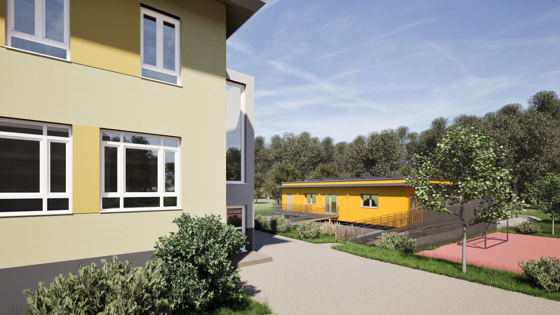 Erweiterung eines bestehenden Schulgebäudes in Holzbauweise mit einer zusätzlichen Nutzfläche von ca. 435 m². Aufgrund der Lage in einem hochwassergefährdeten Gebiet wurde das Gebäude auf ca. 11 m langen Bohrpfählen errichtet und schwebt rund 1 m über dem Gelände. Der Raum unter dem Gebäude bleibt aus Gründen der Hochwasserretention frei und trägt so zur Entlastung des Geländes bei. Die Fassade der Erweiterung wird farblich an den Bestand angepasst und in einem leuchtenden Gelb ausgeführt, wodurch ein freundliches, identitätsstiftendes Erscheinungsbild entsteht.