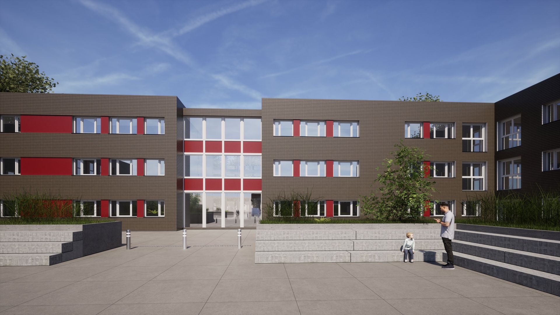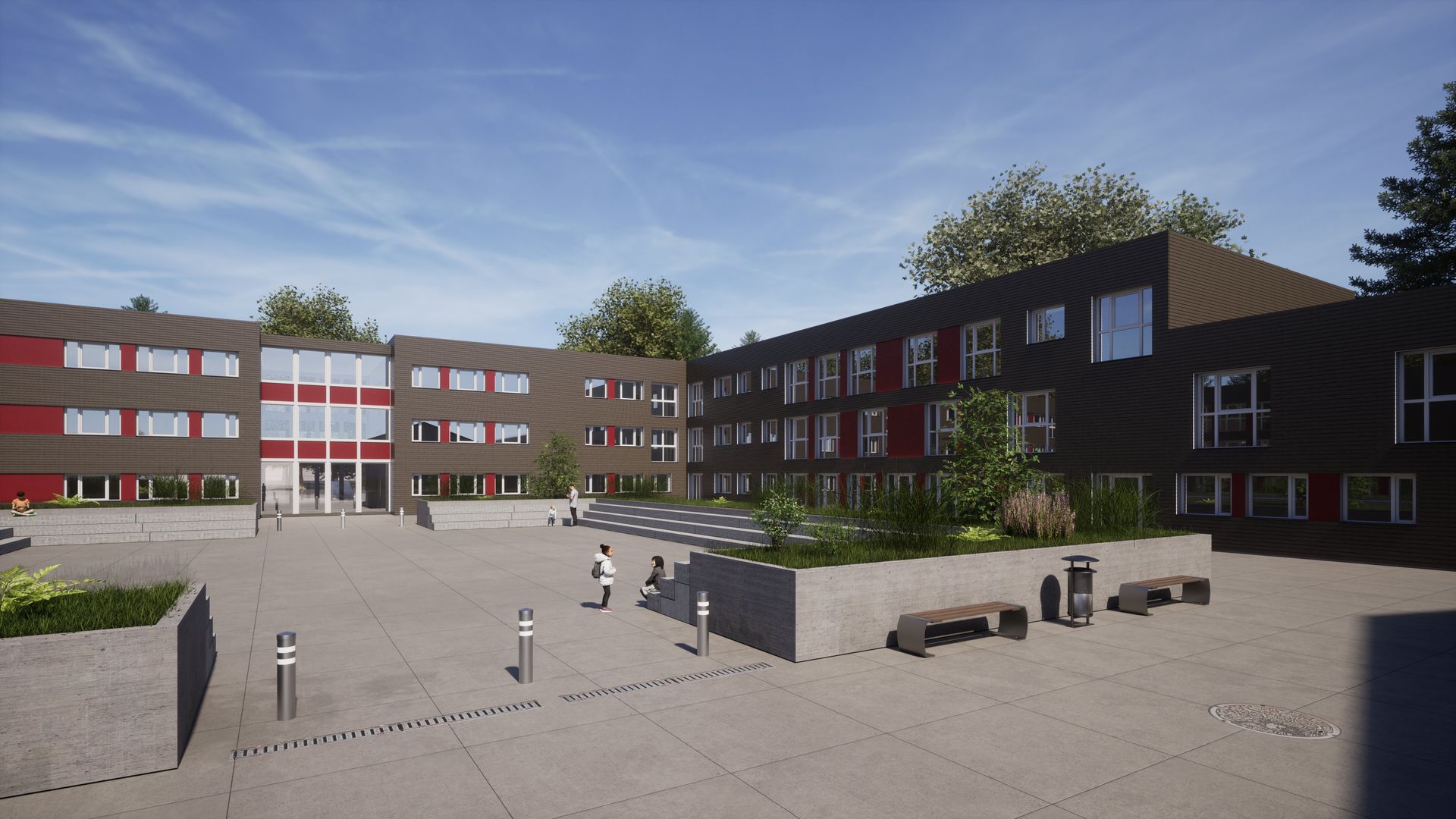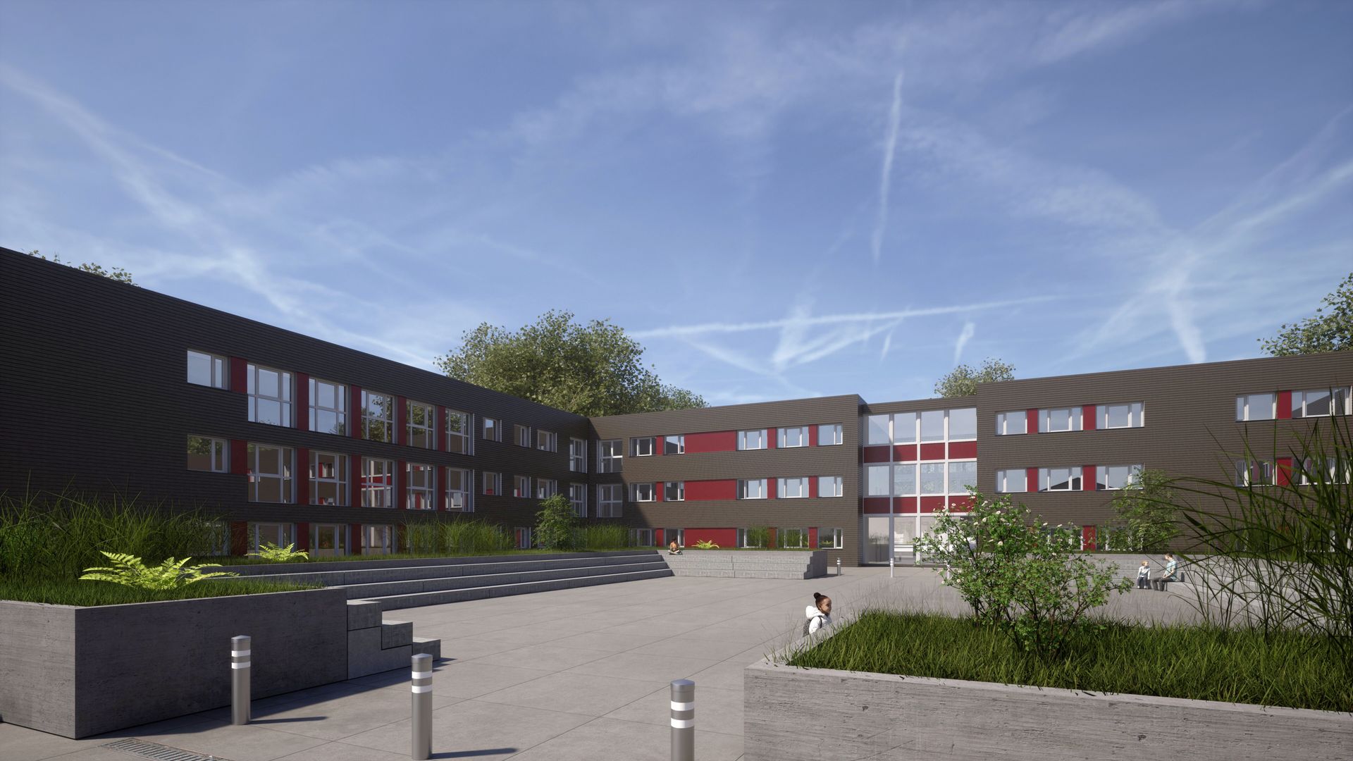 Ersatzneubau einer dreigeschossigen Gesamtschule in U-Form mit einer Nutzfläche von ca. 4.960 m². Das Gebäude bietet moderne Lern- und Aufenthaltsbereiche und orientiert sich in seiner Gestaltung am Bestand. Die Fassade ist mit waagrechter Holzverschalung ausgeführt und durch rote Akzente gegliedert, wodurch eine harmonische Verbindung zwischen Neubau und bestehender Bebauung geschaffen wird. Die kompakte U-Form fördert kurze Wege und eine klare innere Organisation.