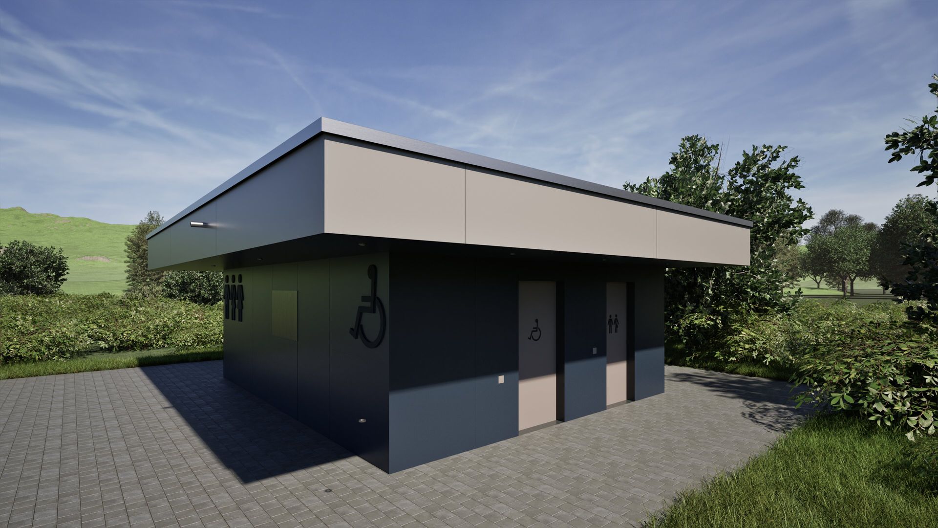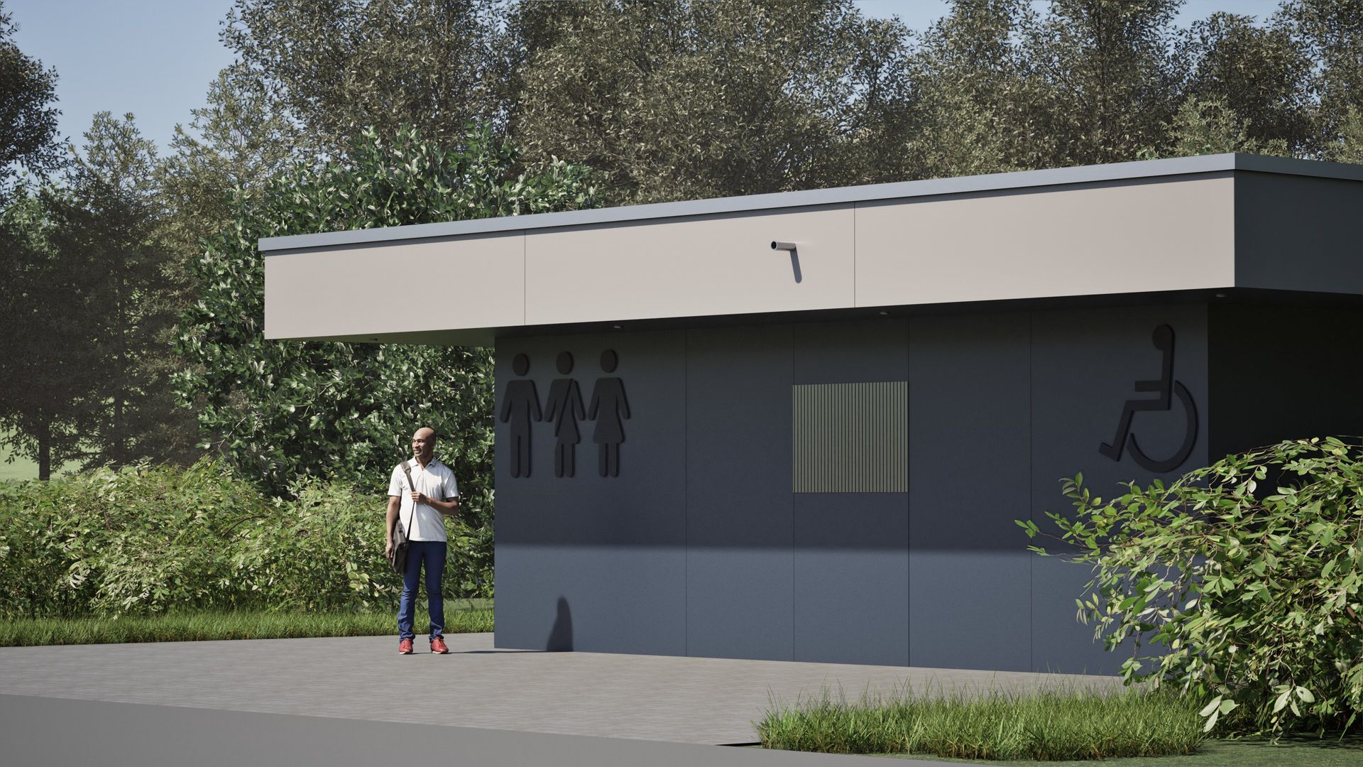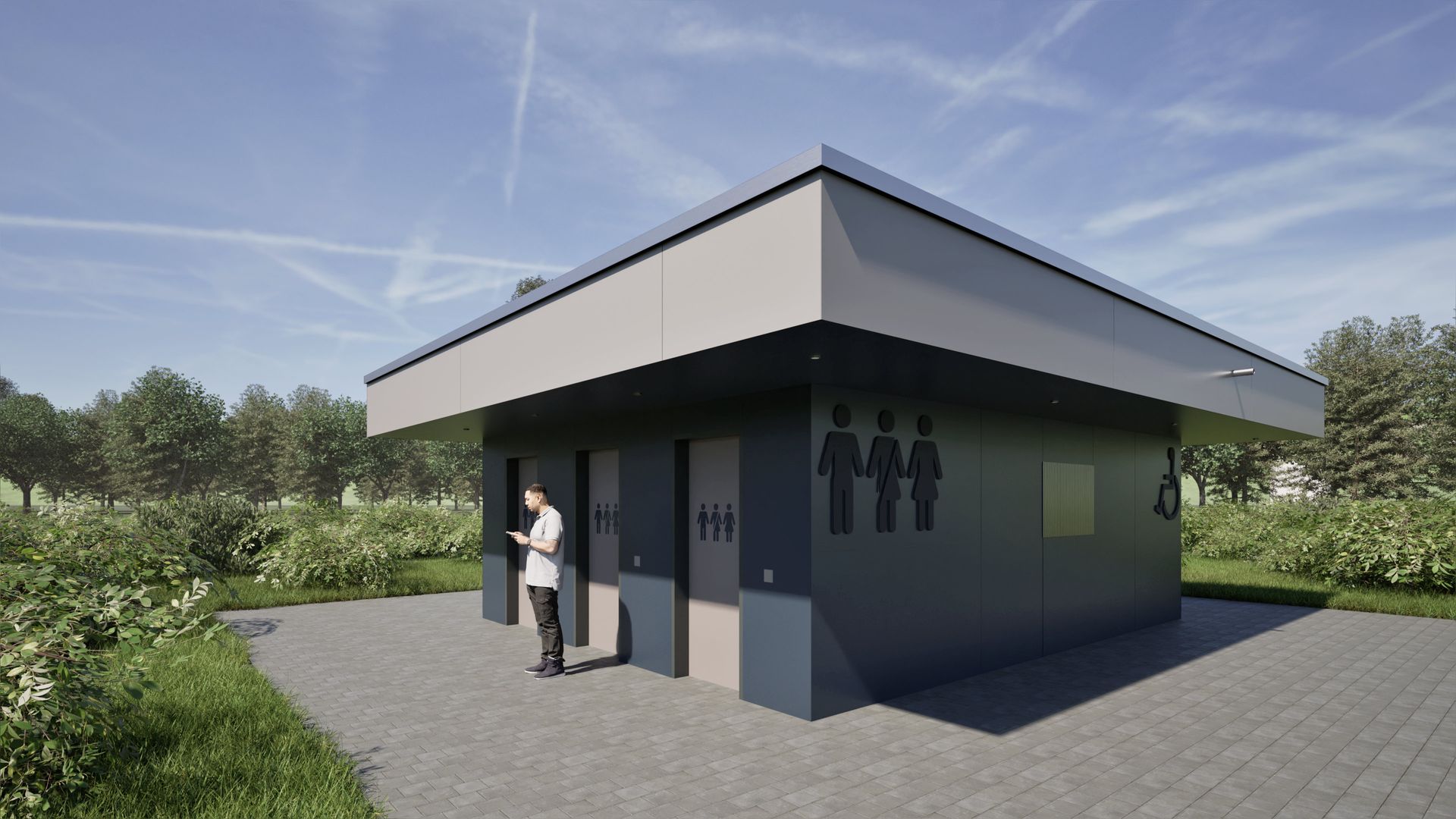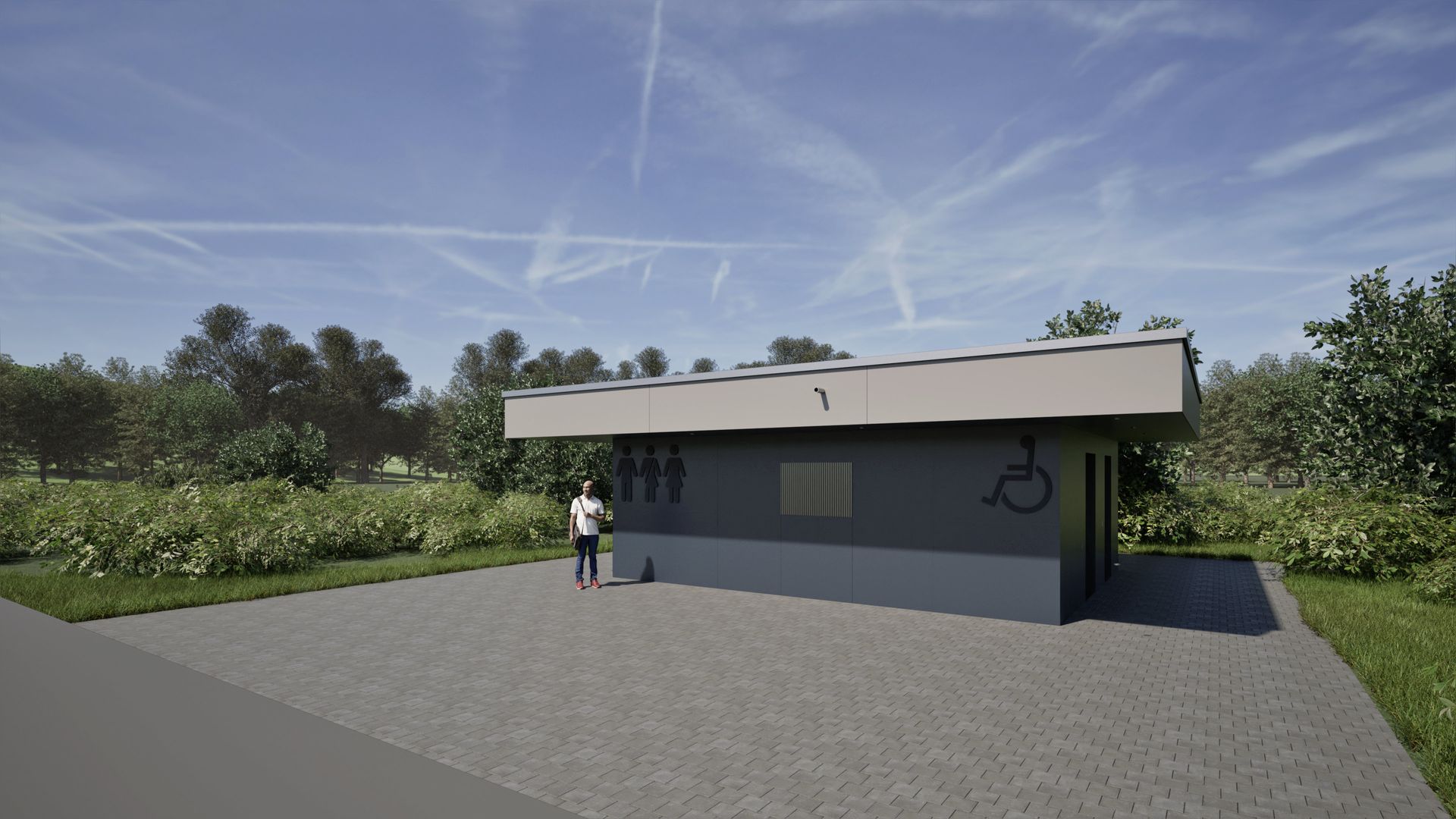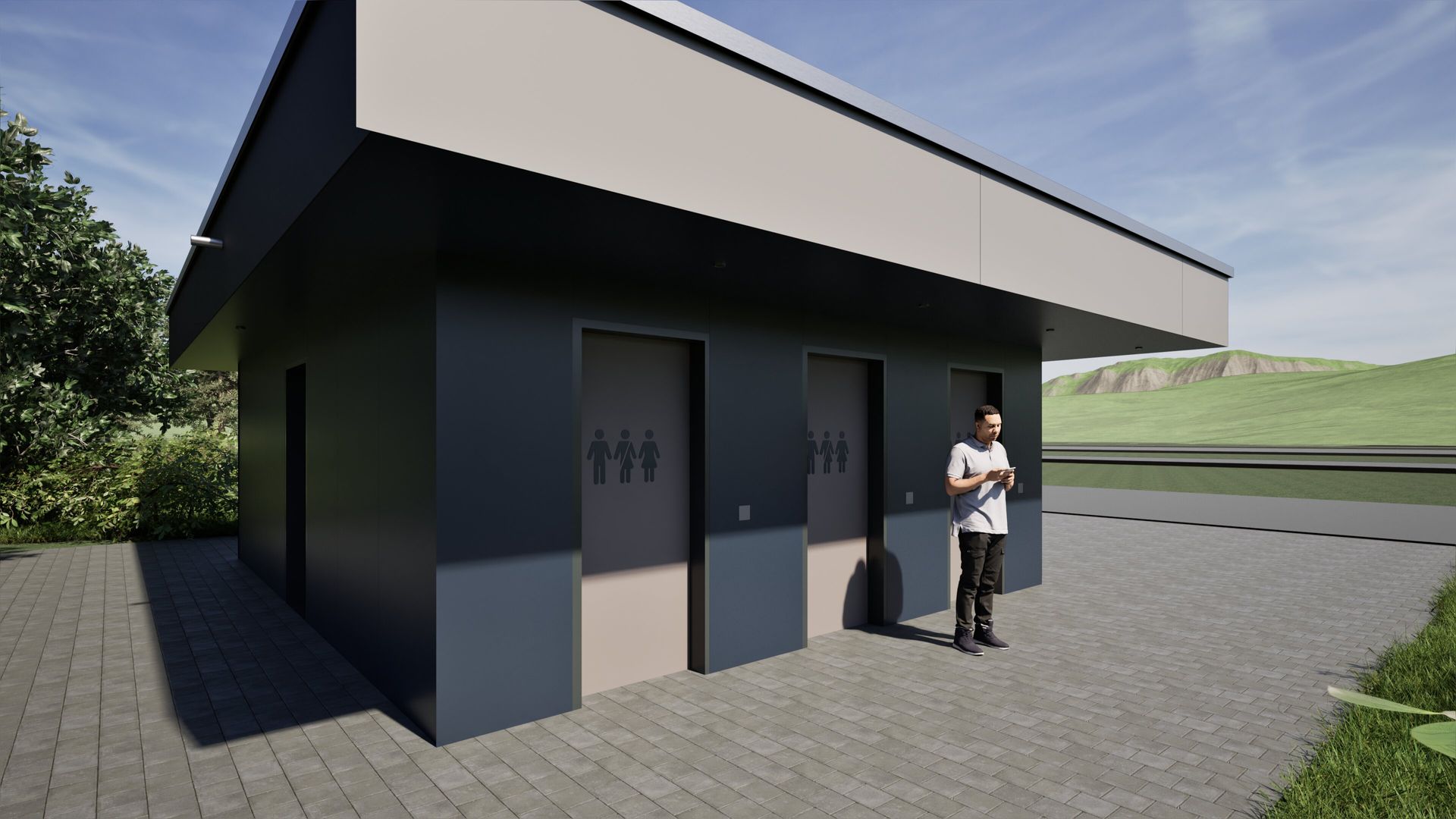 Neubau einer PWC-Anlage an einer Bundesautobahn als funktionale und praxisorientierte Referenzplanung für zukünftige Standorte. Der kompakte Baukörper mit ca. 24 m² Nutzfläche wird durch ein auskragendes Flachdach akzentuiert. Die Ausstattung umfasst drei Unisex-WCs, ein barrierefreies WC sowie ein Pissoir. Die Fassade ist mit HPL-Platten in Blau-Grau-Tönen gestaltet und verleiht dem Gebäude eine moderne, robuste Optik.