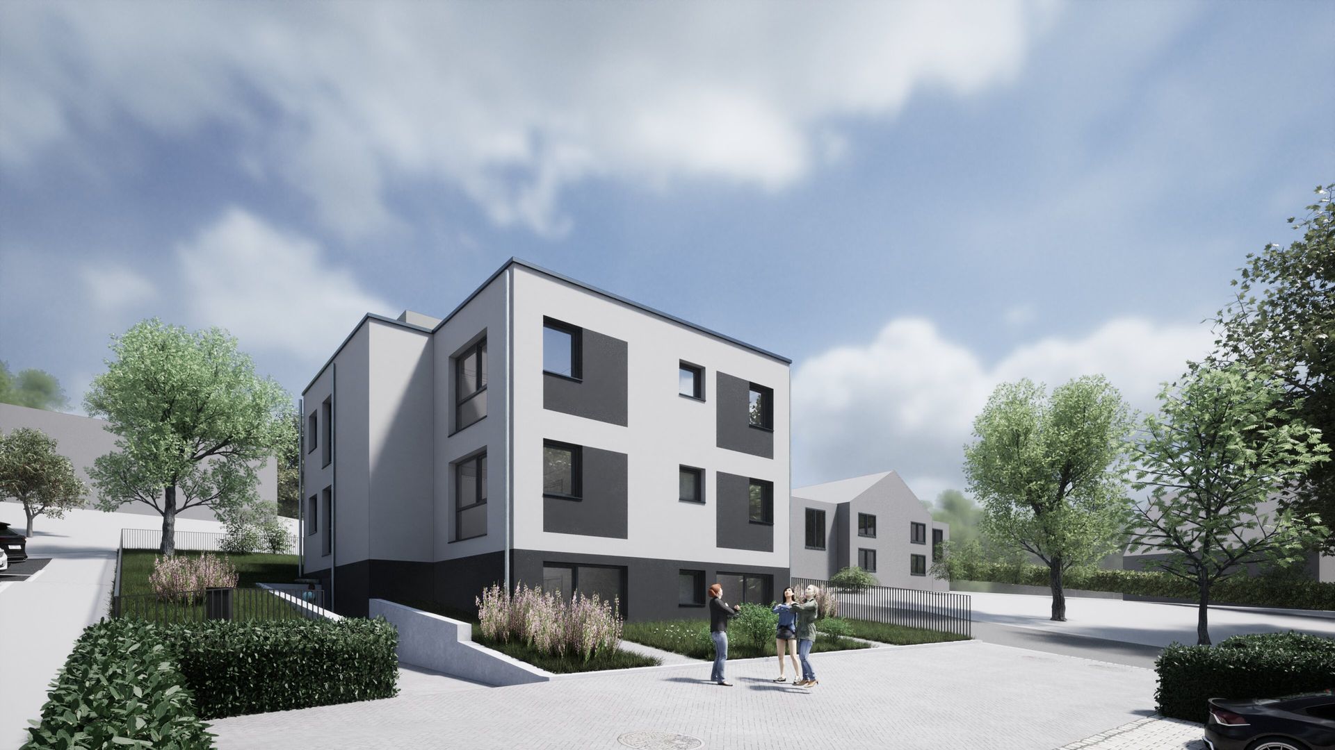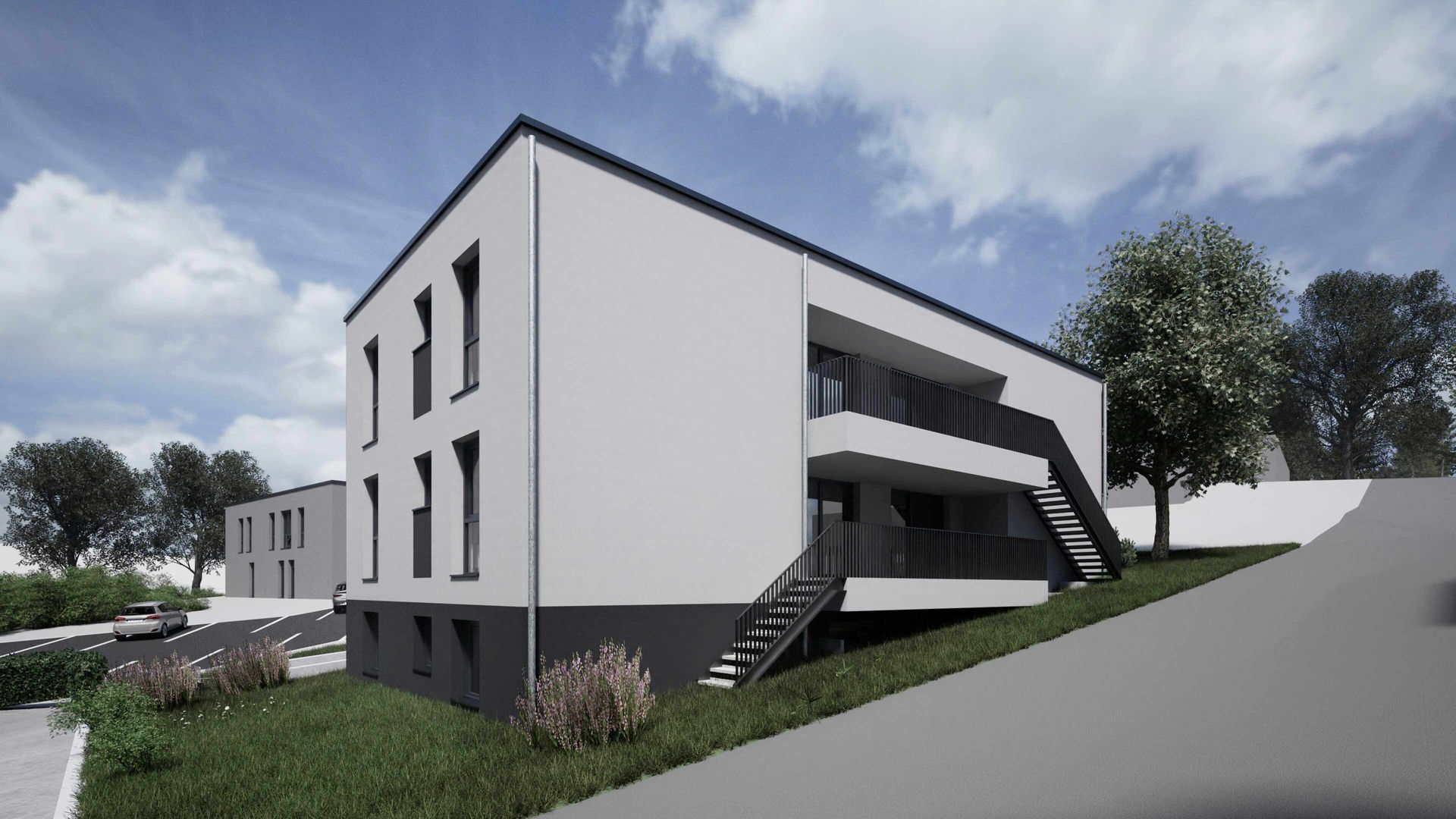 Neubau einer Wohngruppe mit 8 Plätzen für die ambulante Betreuung von Menschen mit Behinderung in Mittelhof. Das dreigeschossige Gebäude umfasst zwei Vollgeschosse und ein Flachdach. Die Nutzfläche beträgt ca. 440 m². Die Fassade ist hell verputzt, das Sockelgeschoss farblich abgesetzt in einem dunkleren Ton, was dem Gebäude eine klare und moderne Erscheinung verleiht.