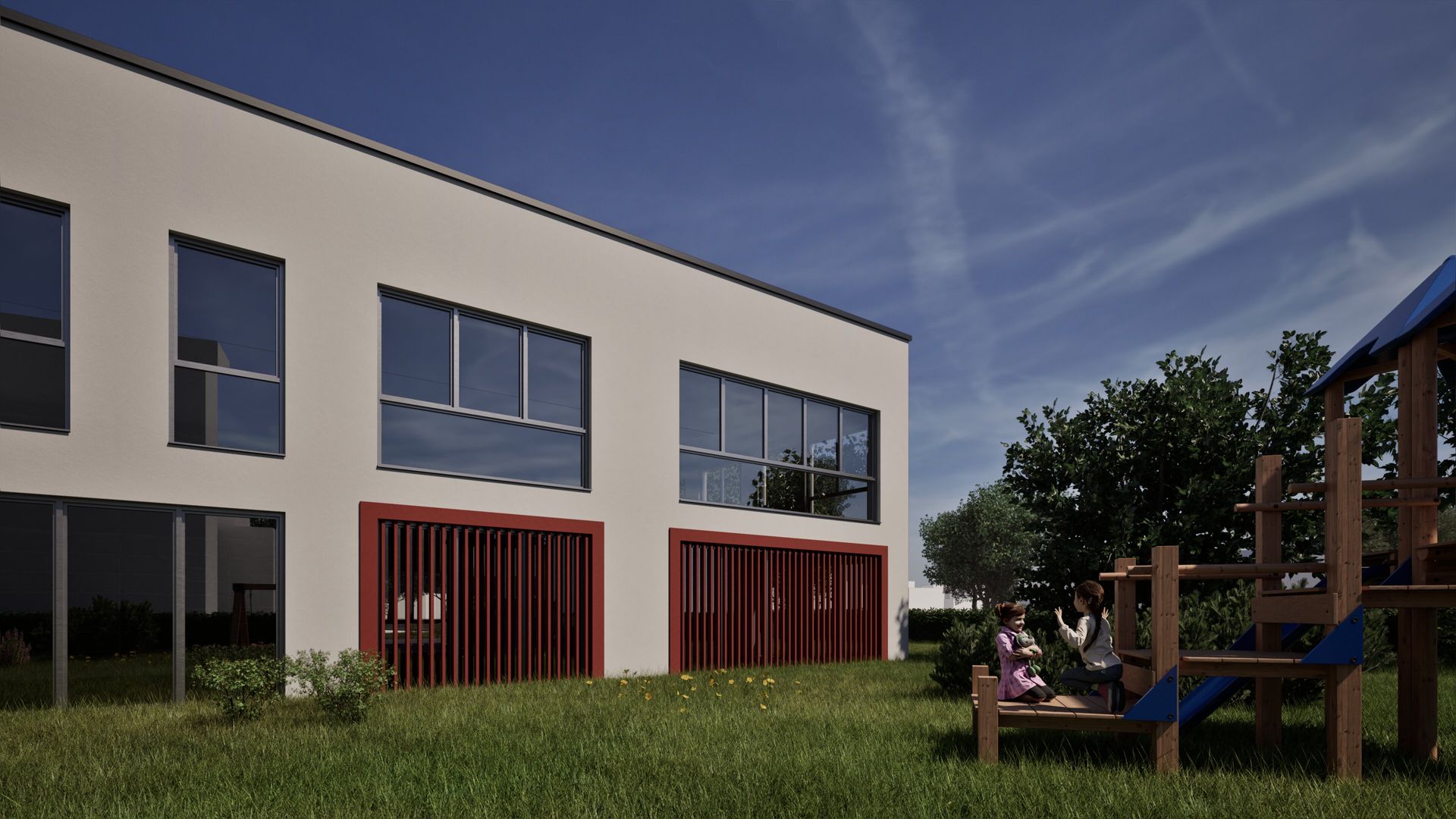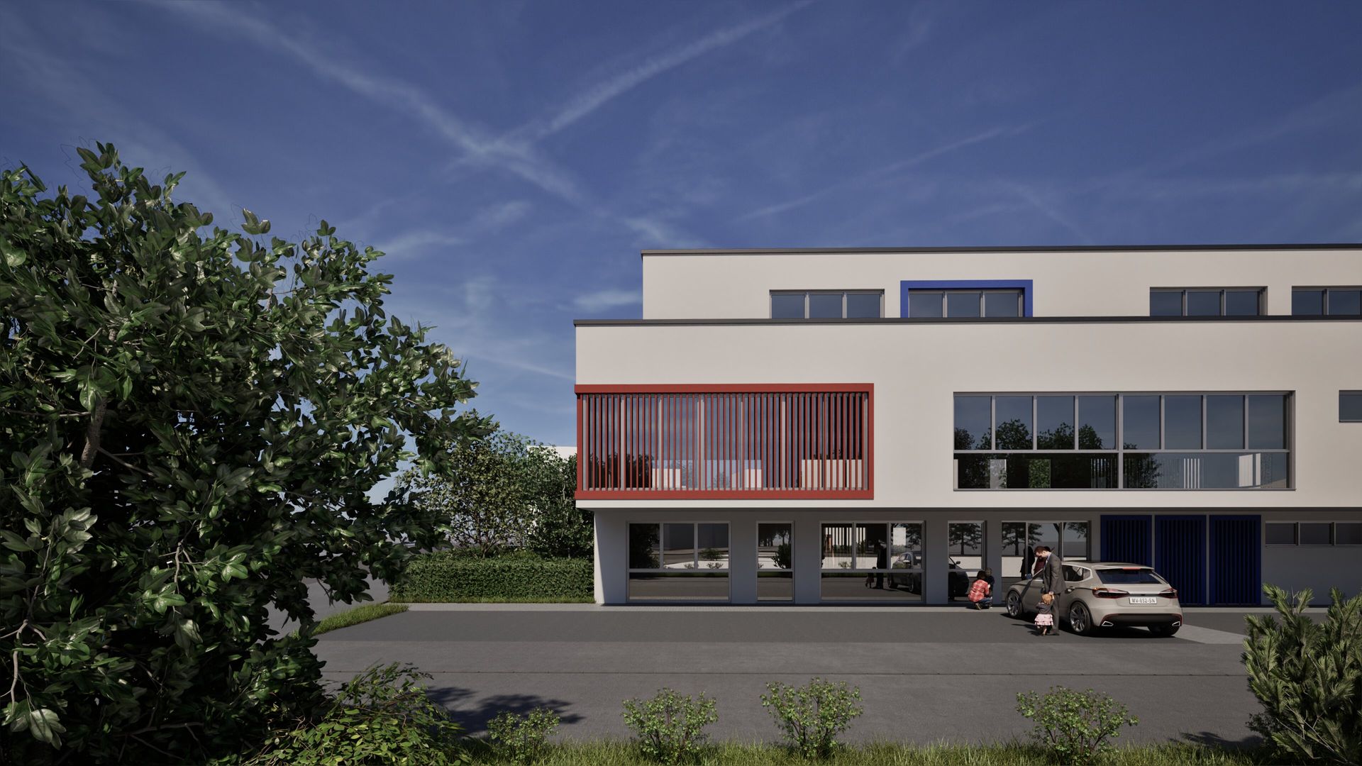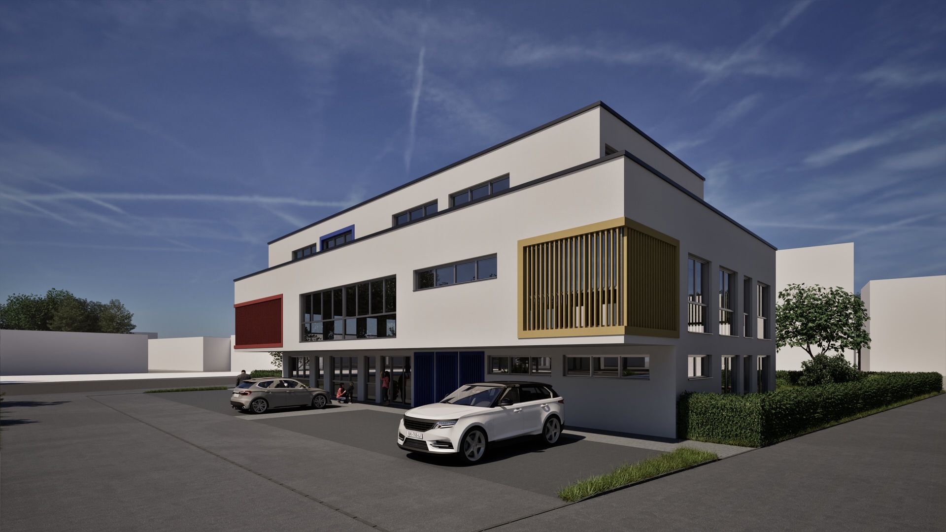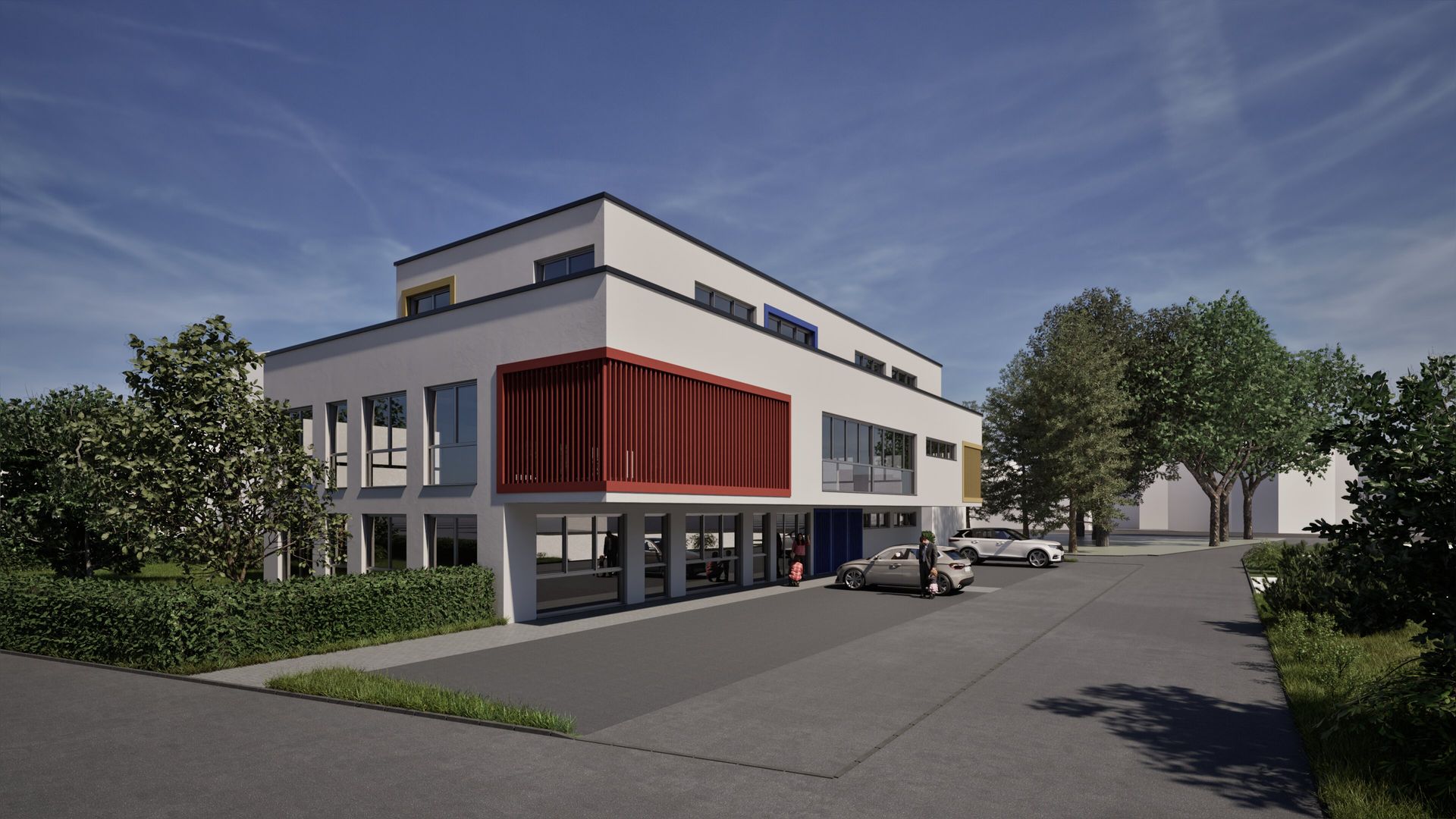 Auf dem Baugrundstück in Wuppertal entsteht eine 4-zügige Kindertagesstätte als zweigeschossiger Baukörper mit Staffelgeschoss und einer geplanten Nutzfläche von ca. 690 m². Zur Flächenoptimierung kragt das Obergeschoss straßenseitig aus. Die Fassade ist in einem schlichten Weiß gehalten und wird durch farbige Fensterfaschen sowie vertikale Holzlatten als Sichtschutz akzentuiert. Das Gebäude vereint funktionale Gestaltung mit einer kindgerechten, freundlichen Architektur.