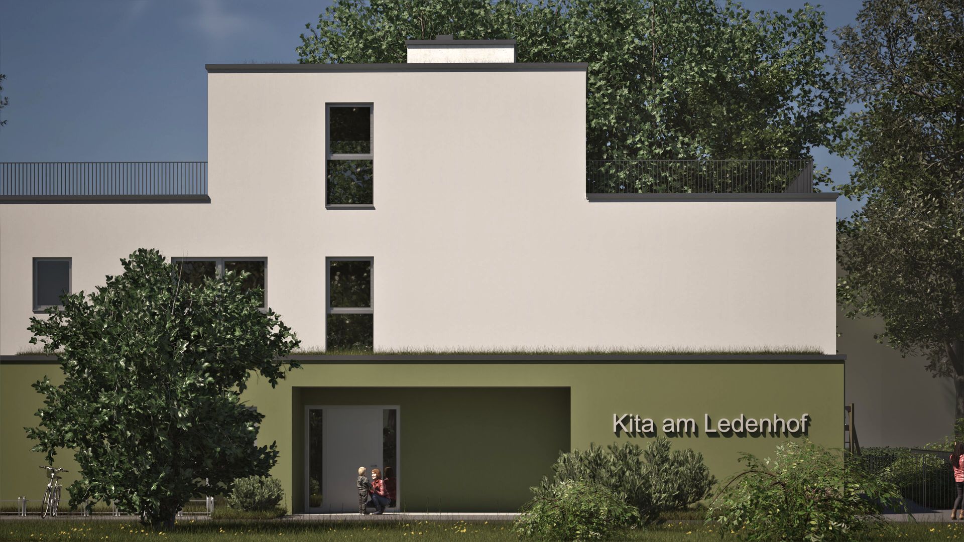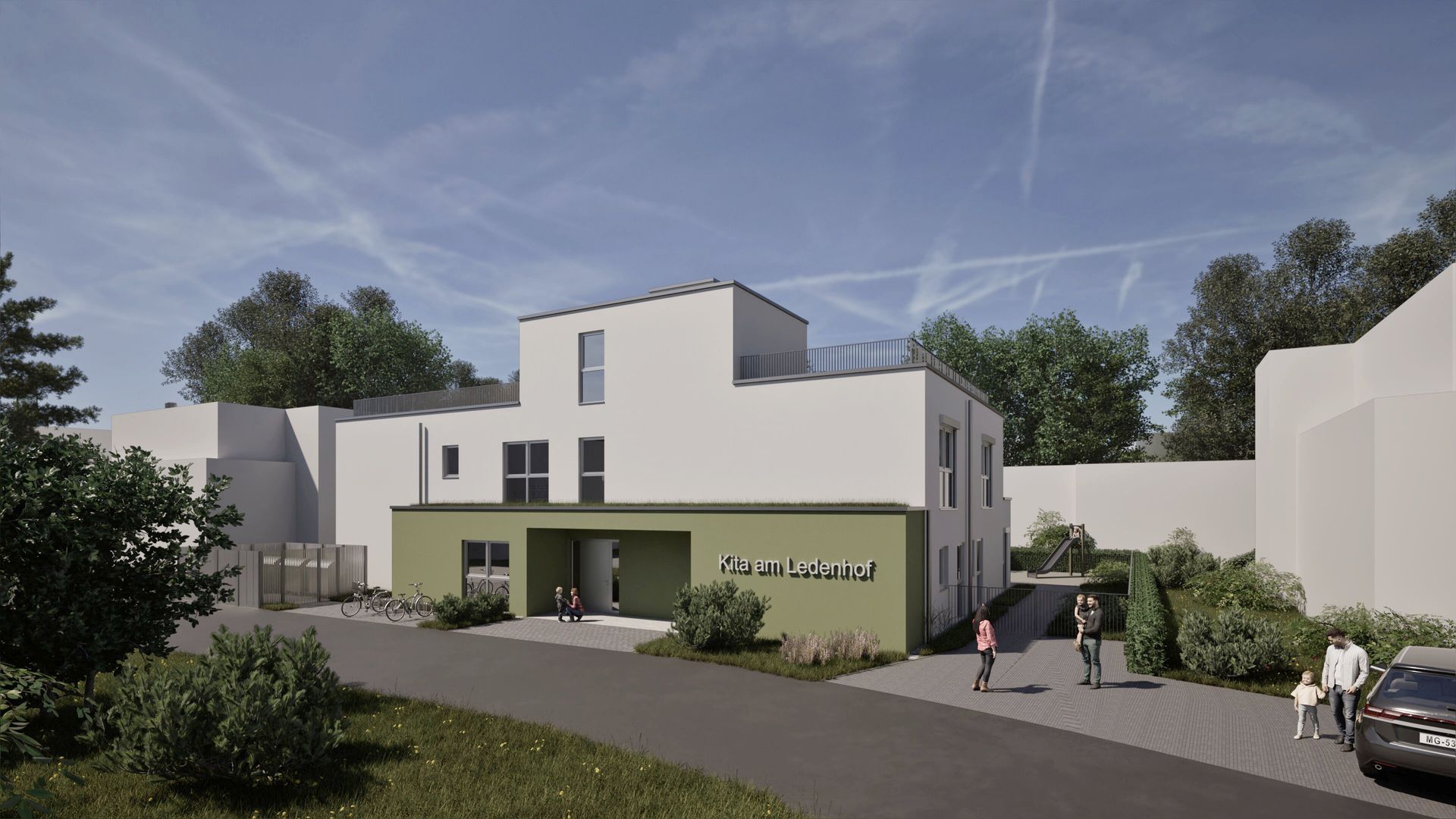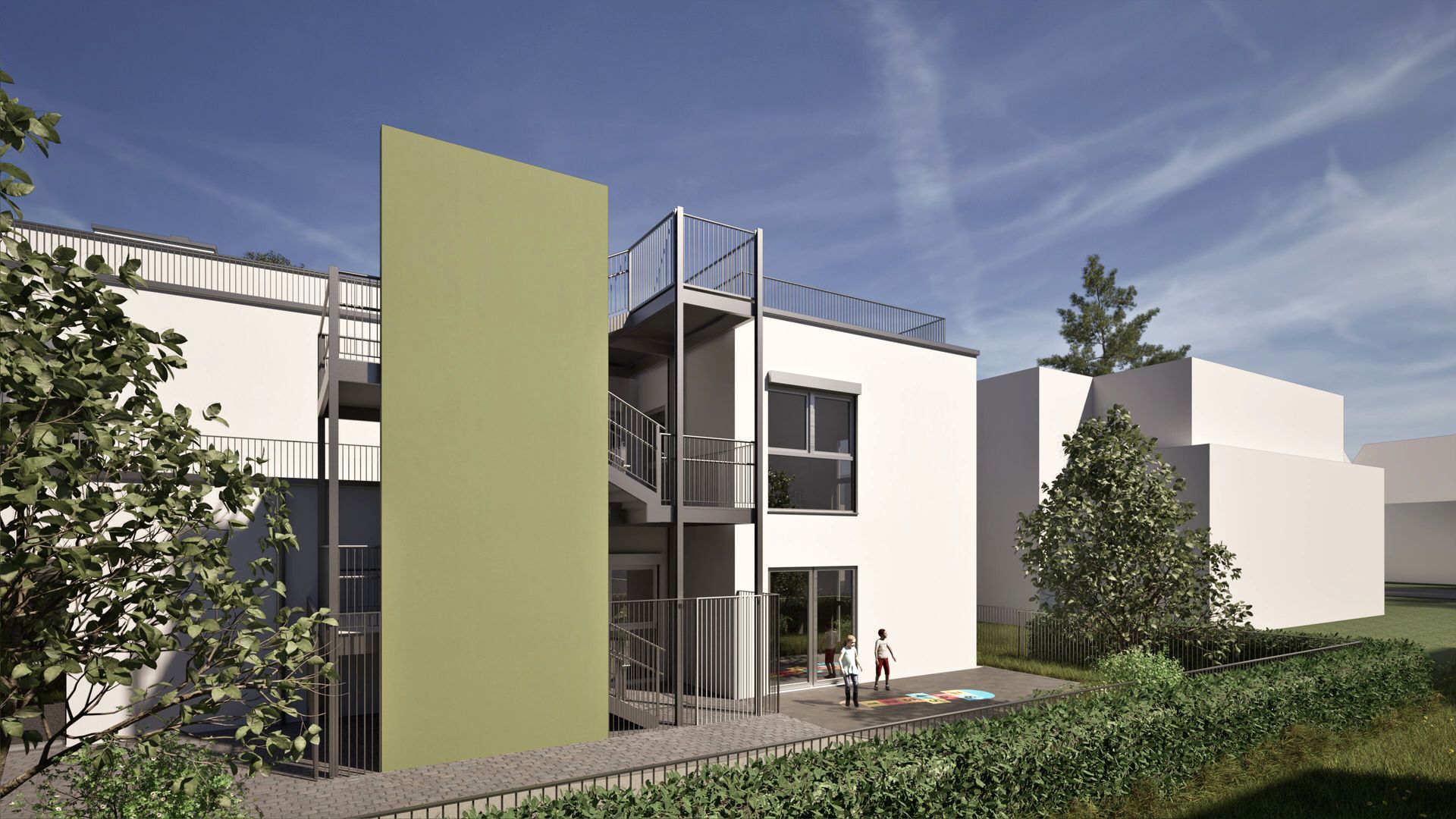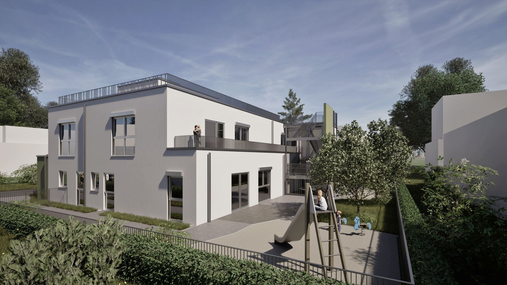 Bei dem Bauvorhaben handelt es sich um den zweigeschossigen Neubau einer 3-gruppigen Kindertagesstätte in Bonn mit einer Nutzfläche von ca. 550 m². Zur Schaffung der notwendigen Außenspielflächen wurde das Flachdach als Spielbereich ausgelegt und kindgerecht gesichert. Der Zugang zum Dach erfolgt über ein innenliegendes Treppenhaus. Zusätzlich wurde ein außenliegender Treppenturm errichtet, der gestalterisch in das Gebäude integriert ist und als zweiter baulicher Rettungsweg dient. Die Fassade des Gebäudes ist in Weiß und Grün verputzt und vermittelt ein freundliches, modernes Erscheinungsbild. Ziel des Projekts ist die Realisierung eines funktionalen, sicheren und kindgerechten Betreuungsorts für Kinder im Vorschulalter.