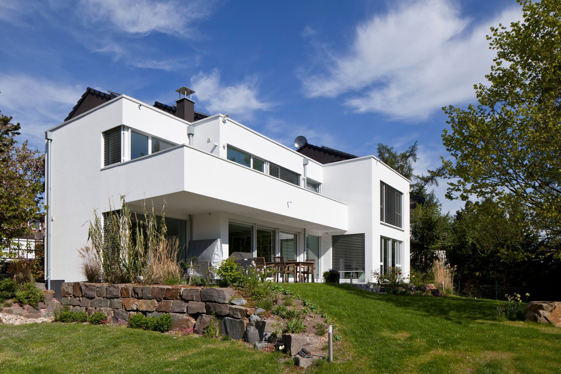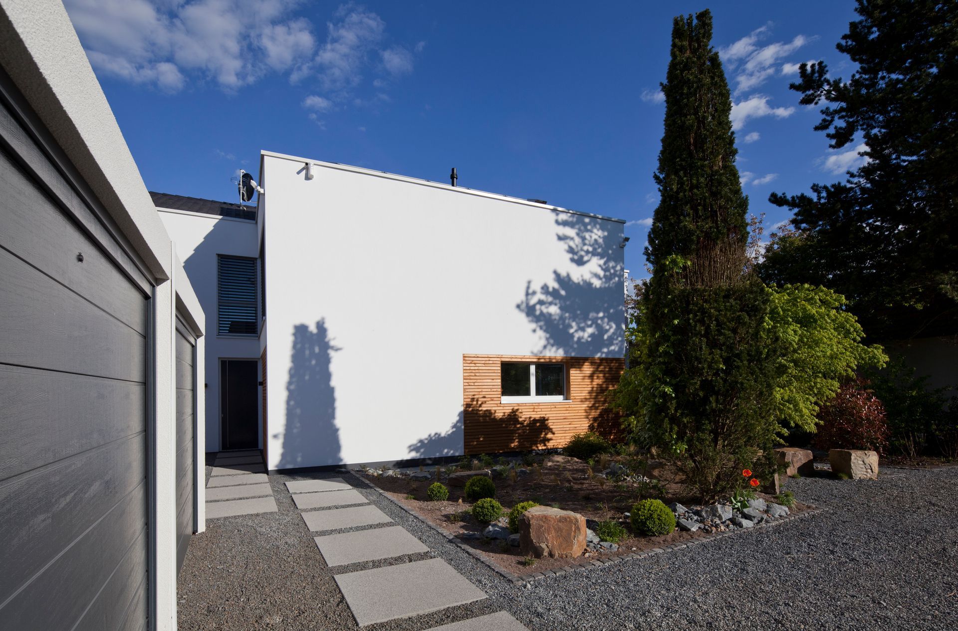 Zweigeschossiger Neubau eines Zweifamilienhauses mit Flachdach in Rösrath. Das Gebäude bietet ca. 320 m² Wohnfläche und ist so konzipiert, dass es zwei separate Wohneinheiten beherbergt. Die Fassade ist hell verputzt und sorgt für eine moderne, zeitlose Optik. Ergänzt wird das Haus durch eine Dreifachgarage.
