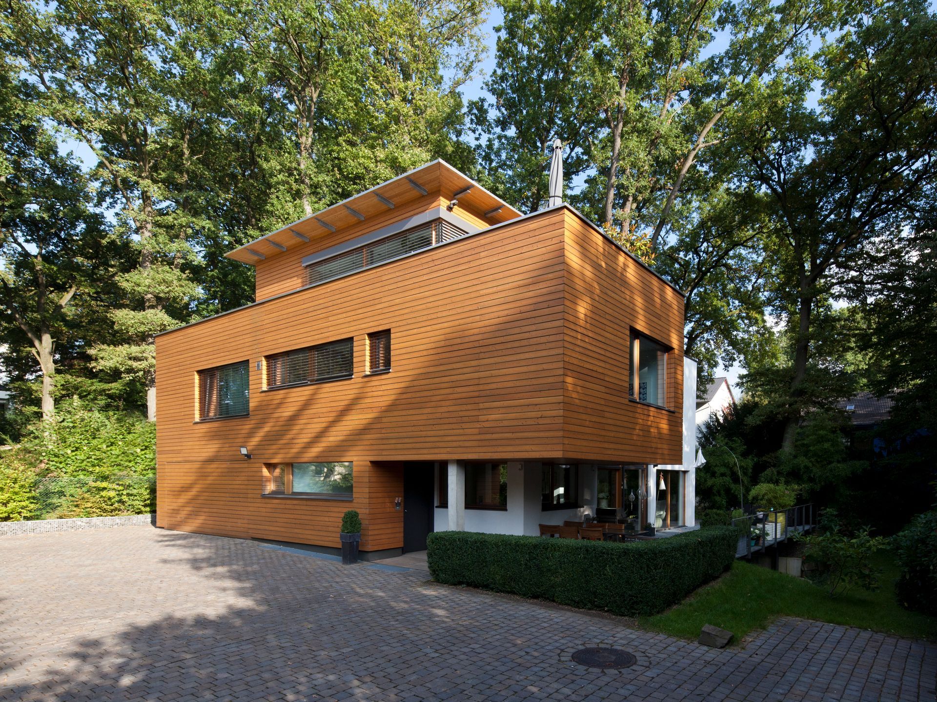 Dreigeschossiger Neubau eines Zweifamilienhauses mit zwei Vollgeschossen und einem Staffelgeschoss mit Flachdach. Die Fassade ist mit einer waagrechten Holzverschalung versehen, die dem Gebäude eine moderne und natürliche Optik verleiht.