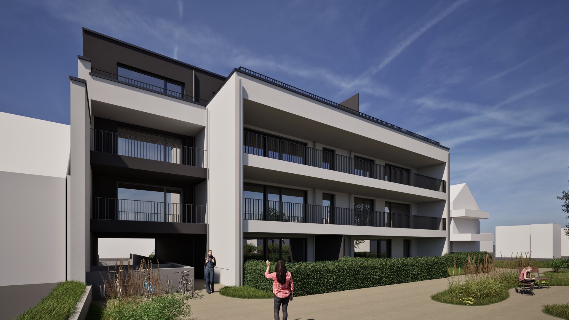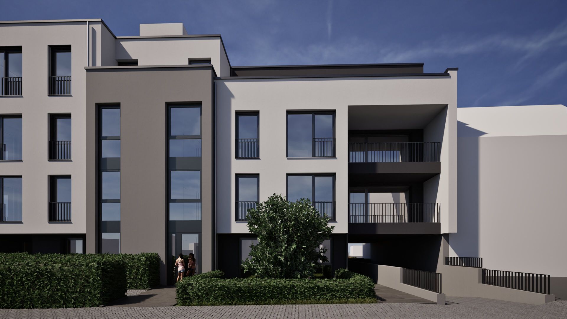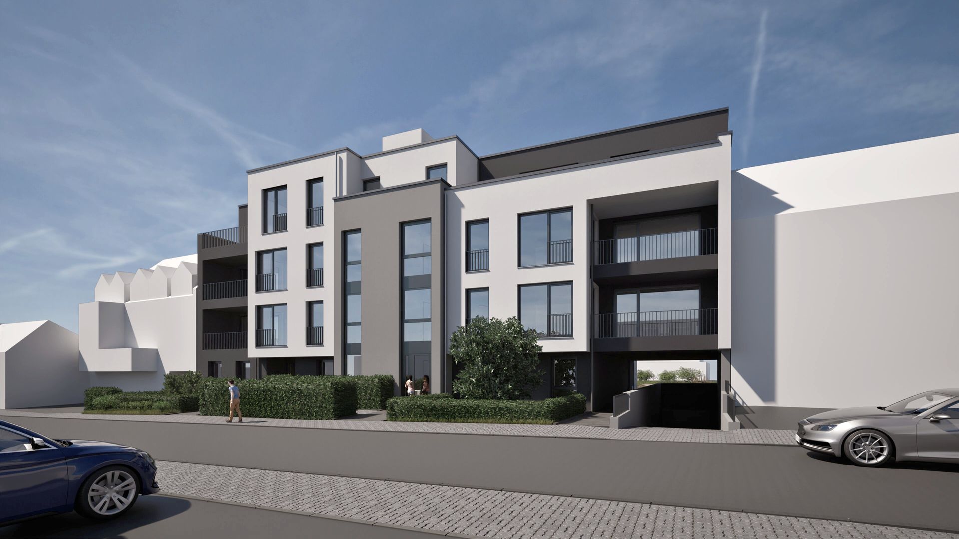 Dreigeschossiger Neubau eines Mehrfamilienhauses mit 11 Wohneinheiten in Bergisch Gladbach. Das Gebäude umfasst drei Vollgeschosse und ein Staffelgeschoss mit einer Wohnfläche von ca. 1.395 m². Die Fassade ist in unterschiedlichen Grautönen verputzt und verleiht dem Gebäude eine moderne, zurückhaltende Erscheinung. Ergänzt wird das Bauvorhaben durch eine Tiefgarage.