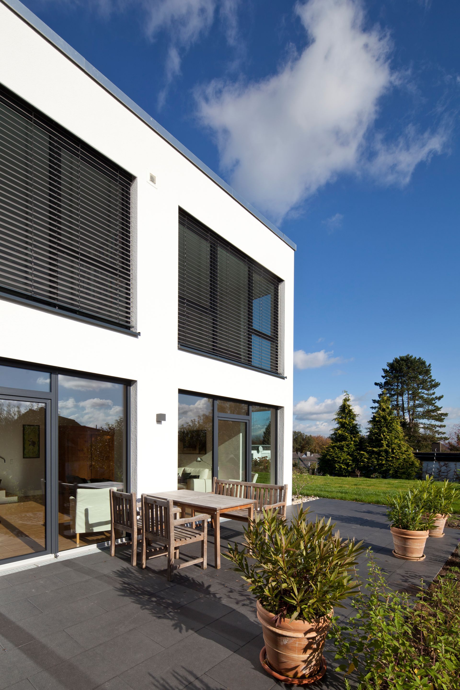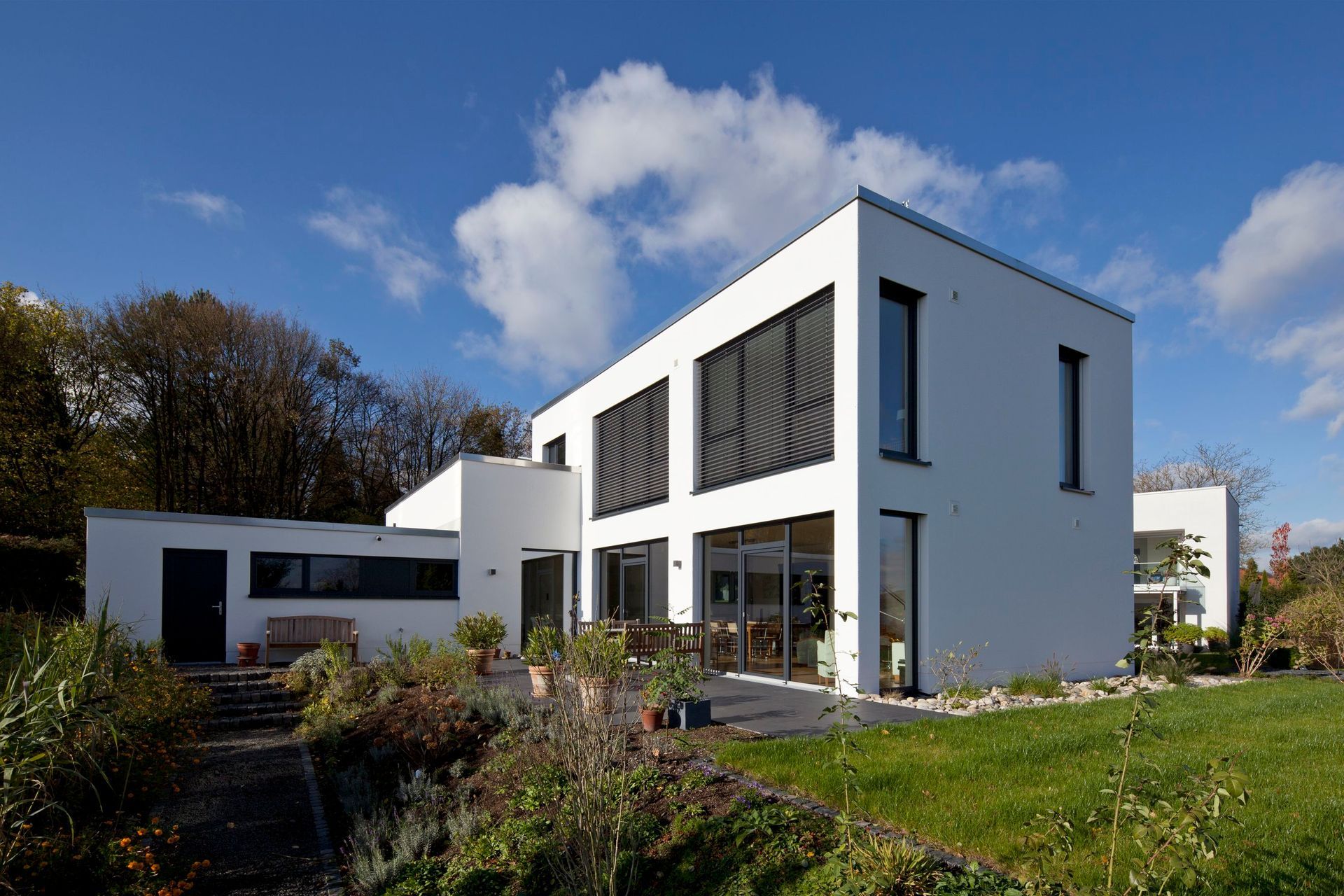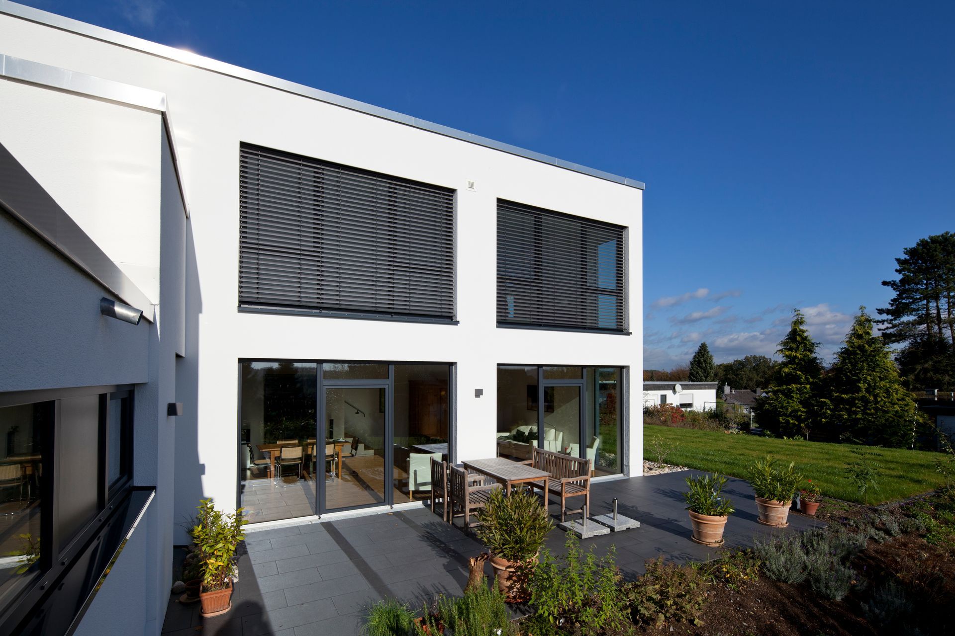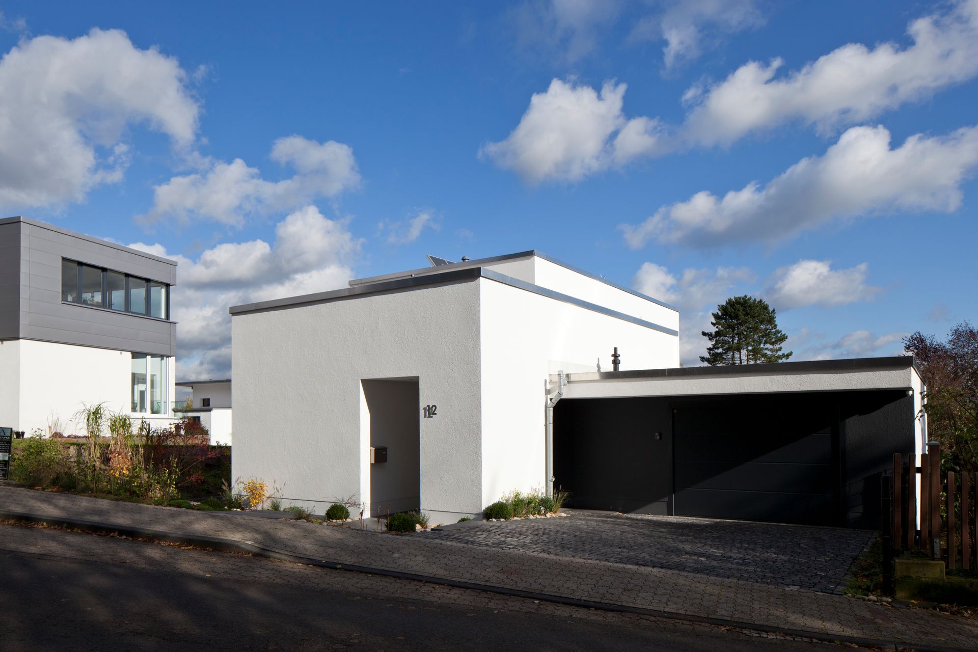 Zweigeschossiger Neubau eines Einfamilienhauses mit Flachdach in Overath. Das Gebäude umfasst ca. 182 m² Wohnfläche mit offenen Bereichen für Wohnen, Essen und Kochen, einem Schlafzimmer sowie zwei Arbeitszimmern. Die Fassade ist klar gegliedert und mit hellem Putz ausgeführt. Ergänzt wird das Haus durch eine Garage.