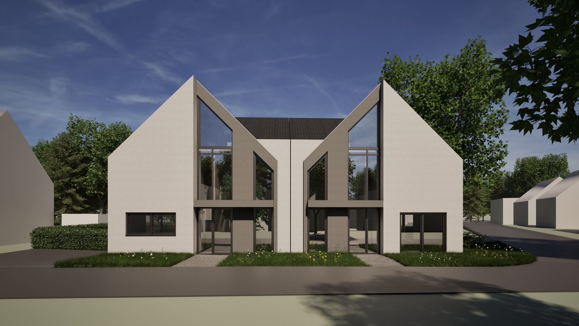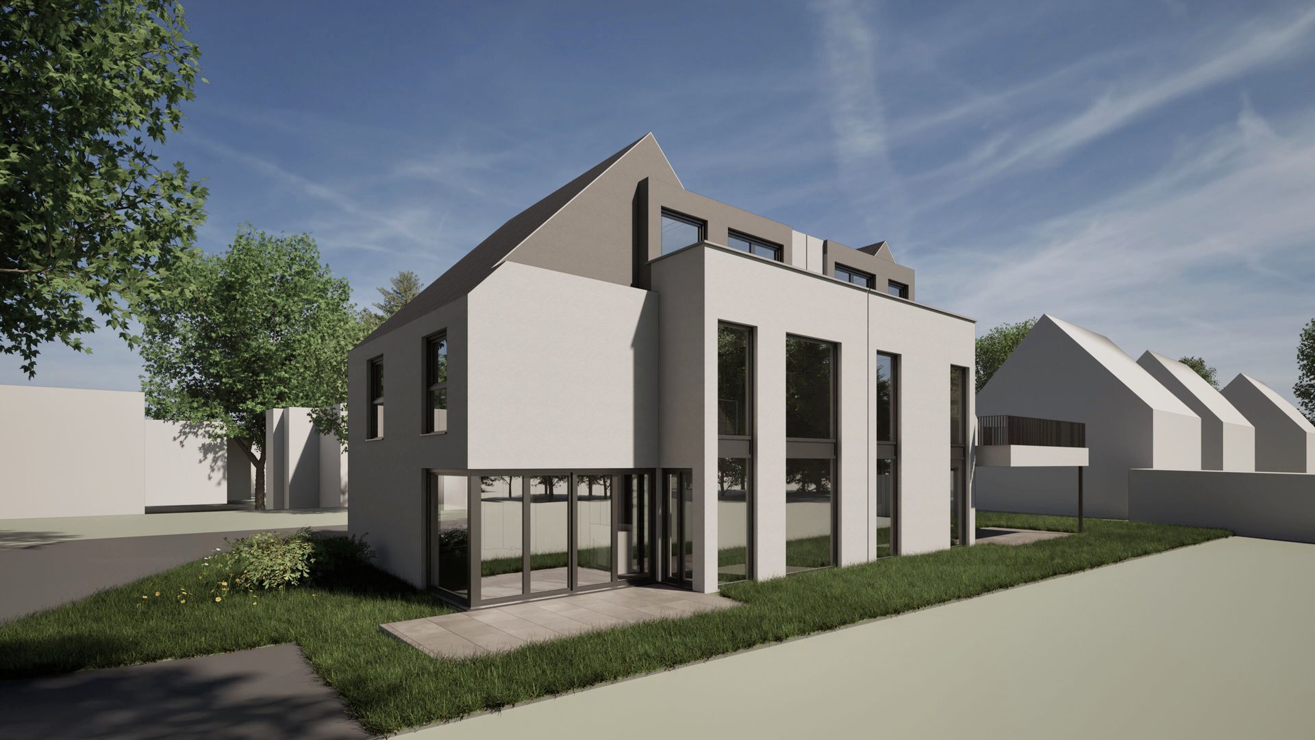 Zweigeschossiger Neubau eines Zweifamilienhauses mit Satteldach in Bergisch Gladbach. Das Gebäude bietet ca. 370 m² Wohnfläche. Die Fassade ist klar gegliedert in weiße und abgetönte Bereiche und verleiht dem Haus eine moderne, strukturierte Erscheinung. Ergänzt wird das Bauvorhaben durch zwei Carports.
