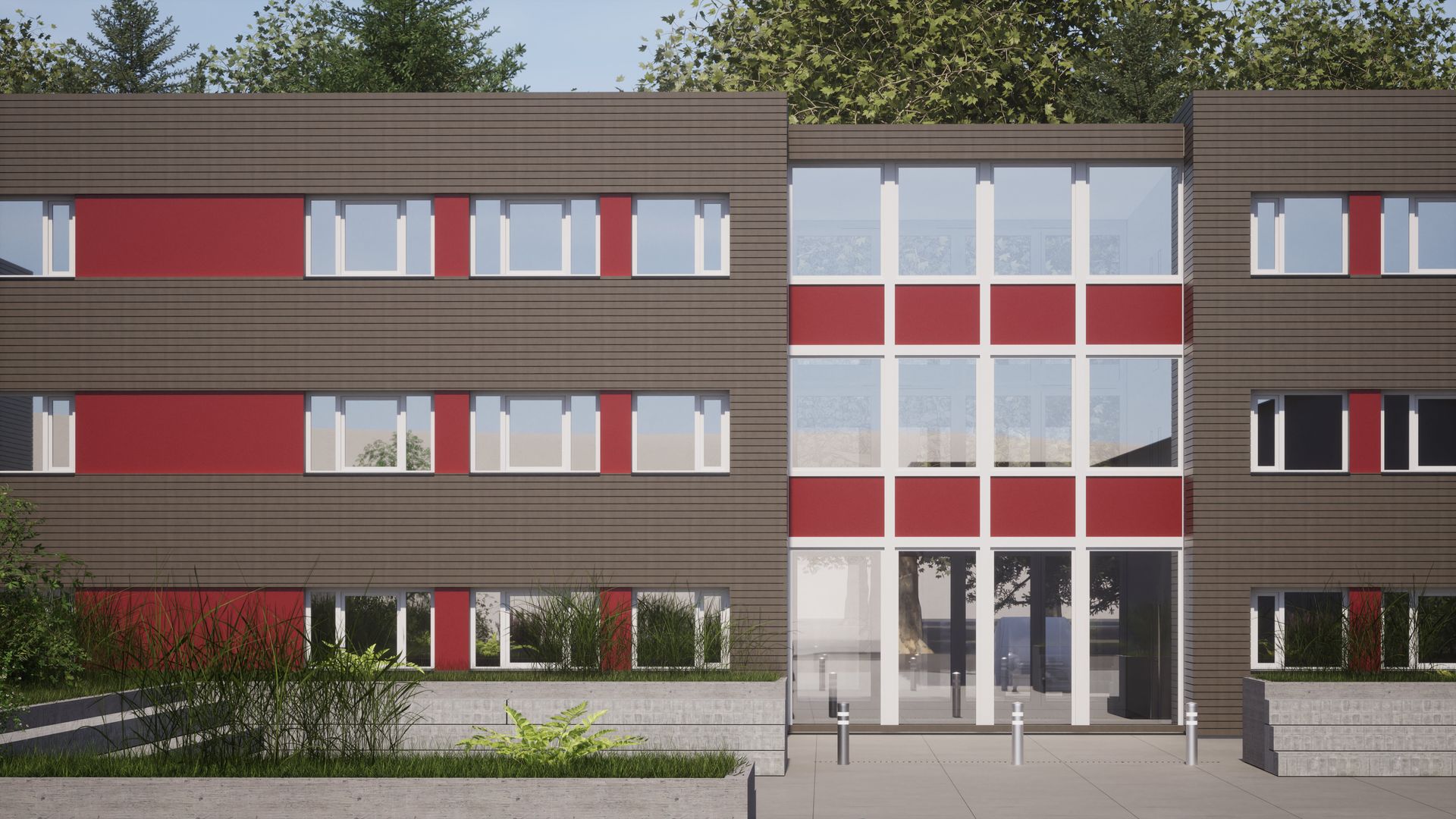 Ersatzneubau einer dreigeschossigen Gesamtschule in U-Form mit einer Nutzfläche von ca. 4.960 m². Das Gebäude bietet moderne Lern- und Aufenthaltsbereiche und orientiert sich in seiner Gestaltung am Bestand. Die Fassade ist mit waagrechter Holzverschalung ausgeführt und durch rote Akzente gegliedert, wodurch eine harmonische Verbindung zwischen Neubau und bestehender Bebauung geschaffen wird. Die kompakte U-Form fördert kurze Wege und eine klare innere Organisation.
