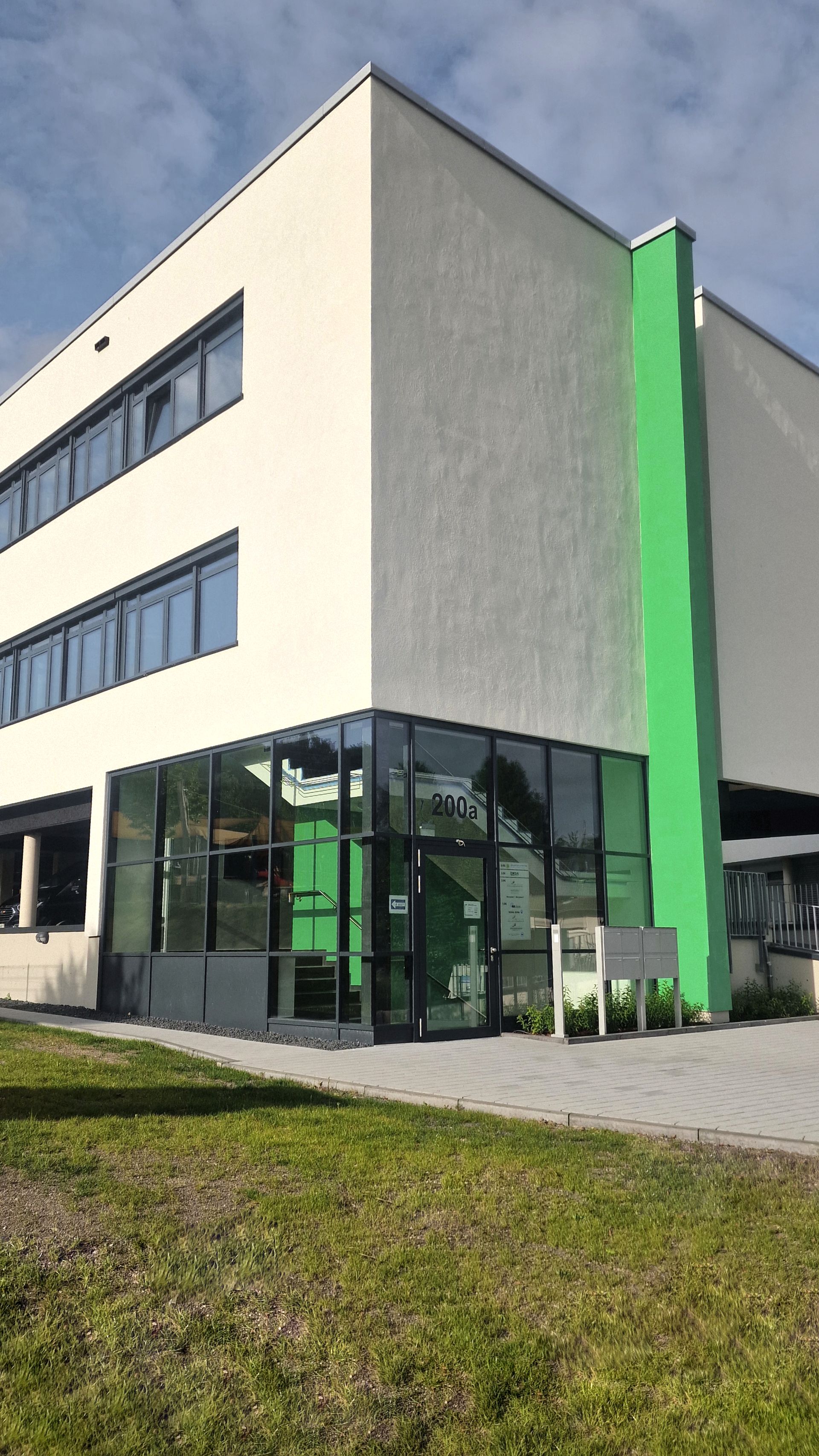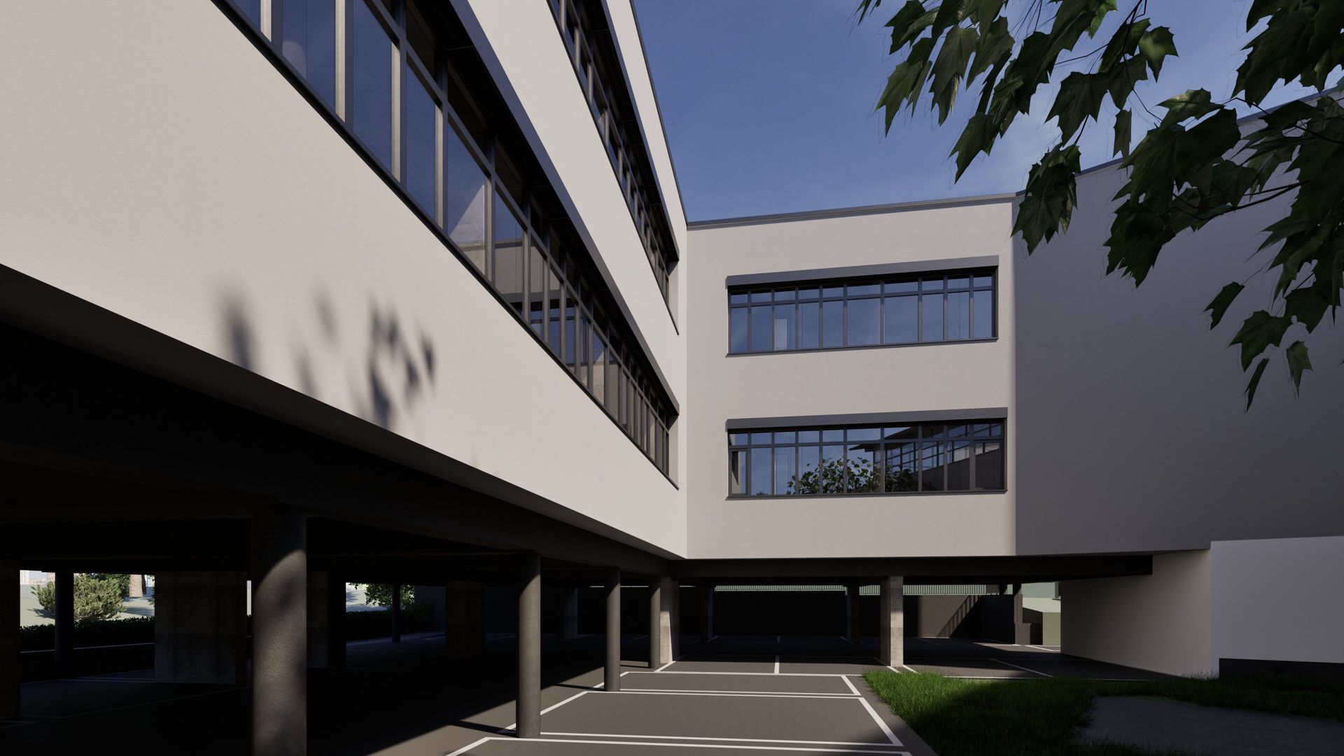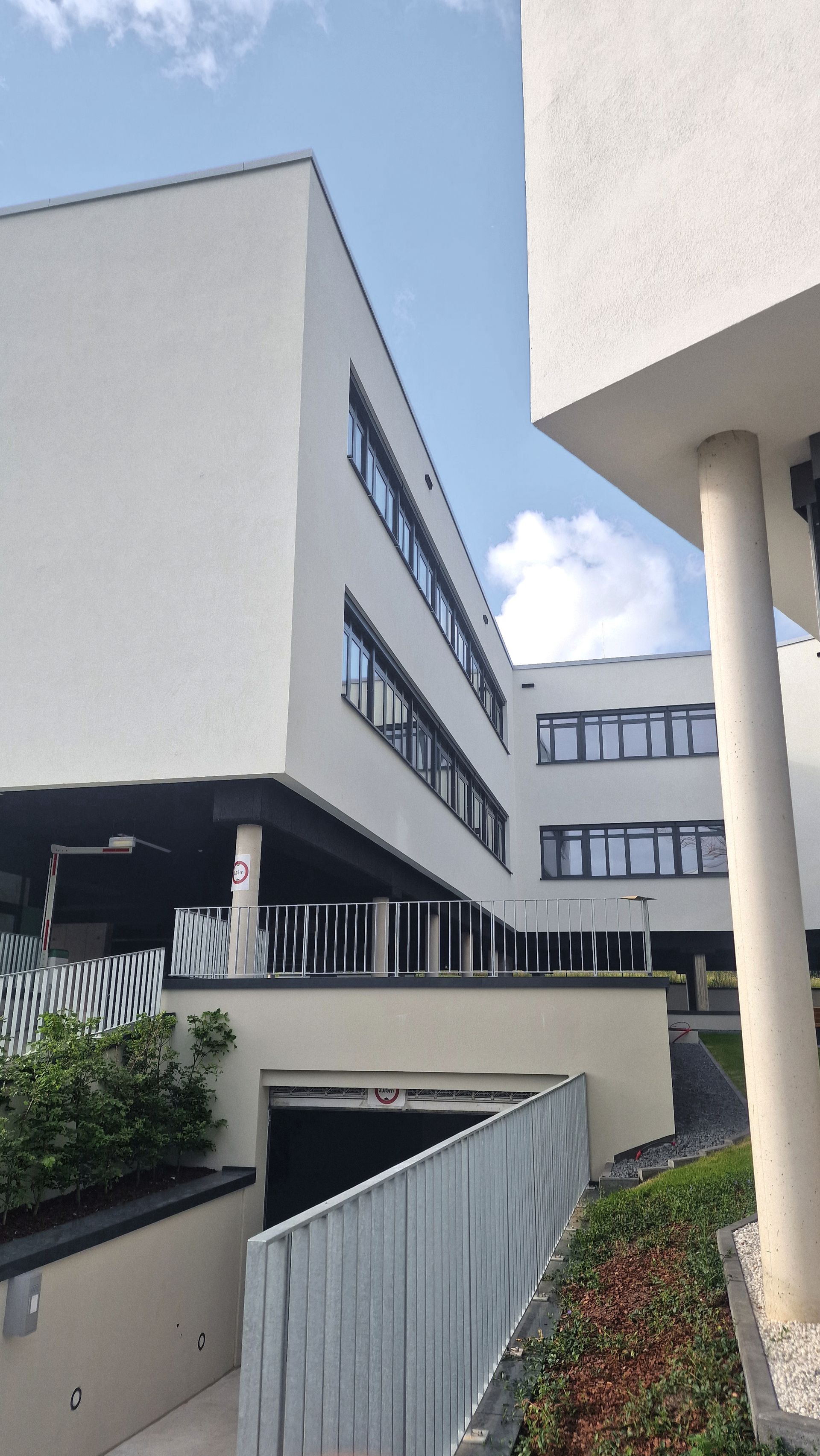 Dreigeschossiger Flachdachanbau an ein vorhandenes Bürogebäude der Kreishandwerkerschaft in Bergisch Gladbach. Der Anbau umfasst zwei Parkebenen, eine offene Parkfläche und eine Tiefgarage, sowie zusätzliche Büroarbeitsplätze auf den oberen Etagen. Mit einer zusätzlichen Nutzfläche von ca. 2.150 m² wird die Bürofläche erheblich erweitert, wodurch mehr Arbeitsplätze geschaffen werden. Die Fassade des Anbaus ist hell verputzt und setzt durch farbliche Akzente in Grün und Blau, die das Firmenlogo widerspiegeln, ein markantes gestalterisches Zeichen. Diese Maßnahme trägt zur optimalen Nutzung des Grundstücks bei und ermöglicht eine flexible Gestaltung der Arbeitsumgebung, um den gestiegenen Anforderungen des Unternehmens gerecht zu werden.