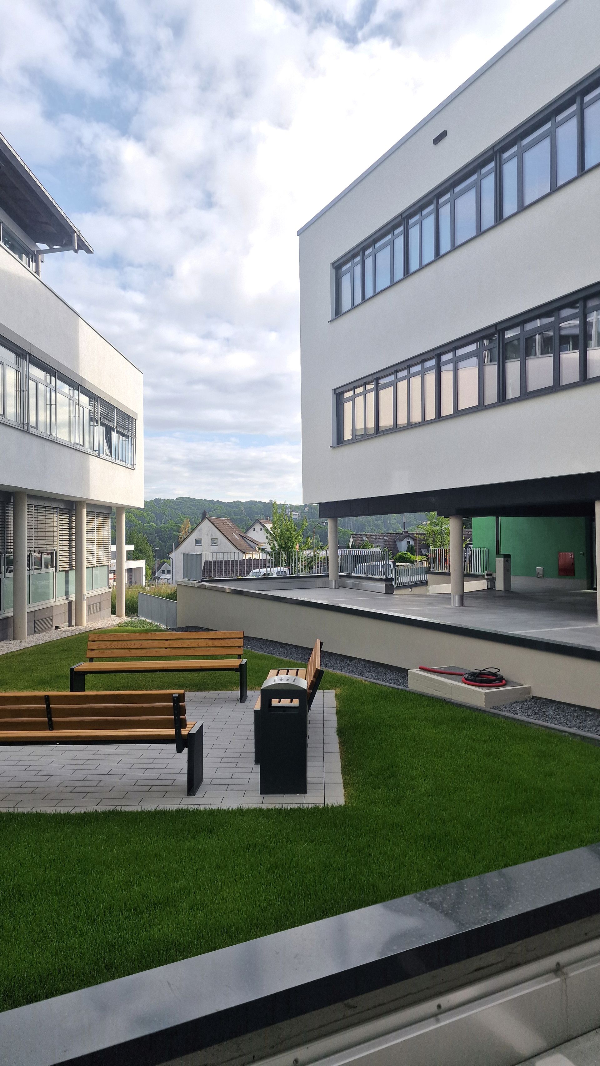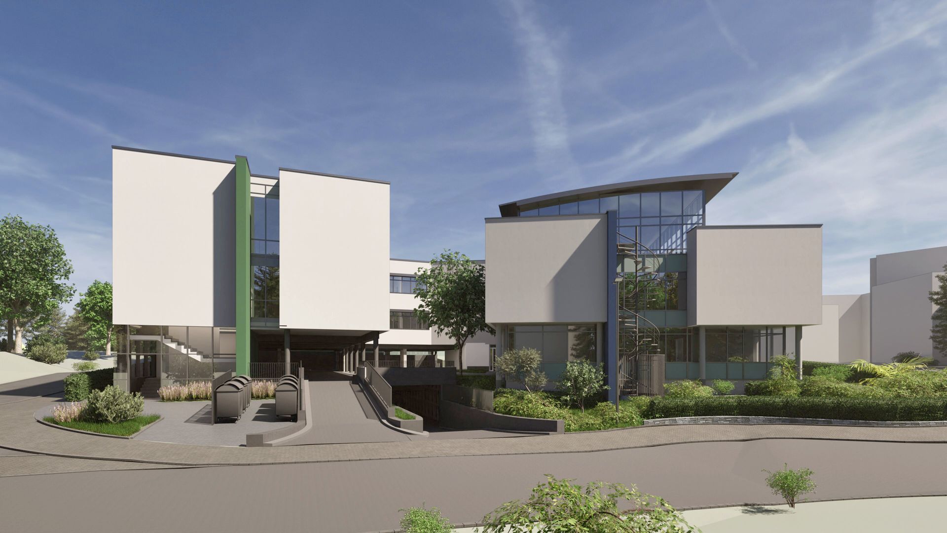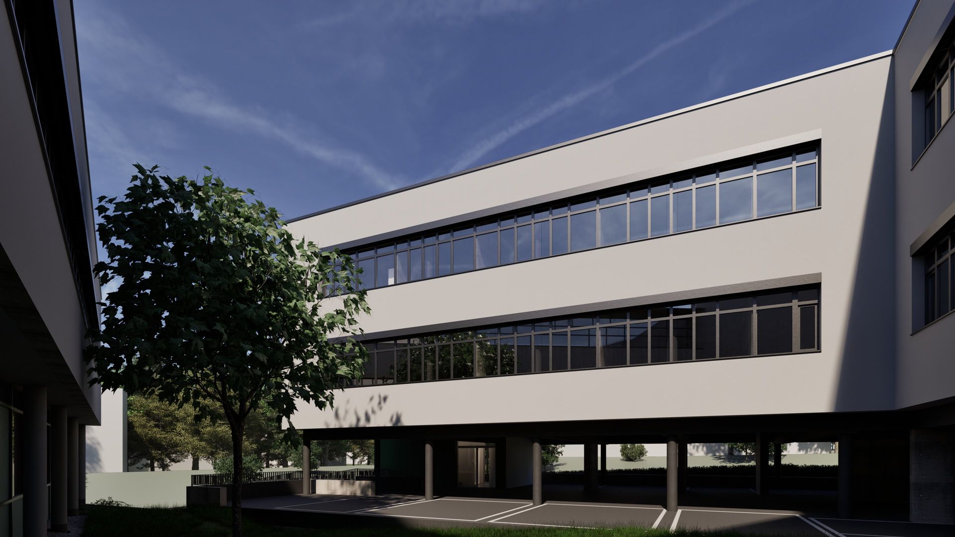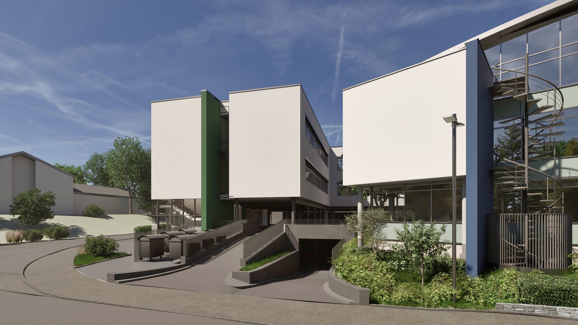 Dreigeschossiger Flachdachanbau an ein vorhandenes Bürogebäude der Kreishandwerkerschaft in Bergisch Gladbach. Der Anbau umfasst zwei Parkebenen, eine offene Parkfläche und eine Tiefgarage, sowie zusätzliche Büroarbeitsplätze auf den oberen Etagen. Mit einer zusätzlichen Nutzfläche von ca. 2.150 m² wird die Bürofläche erheblich erweitert, wodurch mehr Arbeitsplätze geschaffen werden. Die Fassade des Anbaus ist hell verputzt und setzt durch farbliche Akzente in Grün und Blau, die das Firmenlogo widerspiegeln, ein markantes gestalterisches Zeichen. Diese Maßnahme trägt zur optimalen Nutzung des Grundstücks bei und ermöglicht eine flexible Gestaltung der Arbeitsumgebung, um den gestiegenen Anforderungen des Unternehmens gerecht zu werden.